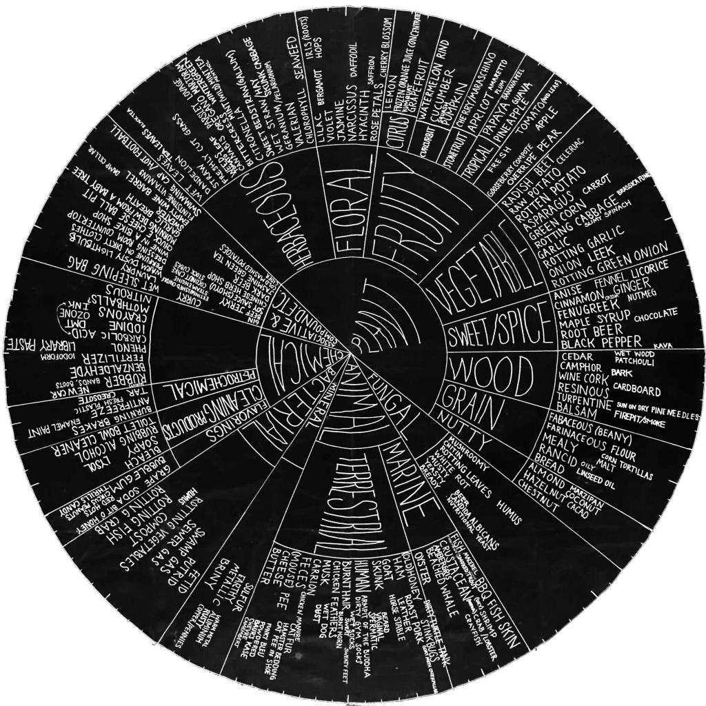 We conceived and developed the wheel collaboratively with input from personal experience, mushroom field guides, and participants who have engaged with the wheel. Indeed, it is an ever-evolving catalogue of smells, and if you have experienced distinct mushroom smells not listed here, please let us know. Smell is interpreted in layers – personally, culturally and contextually, and this wheel continues to grow as more people and fungi interact with it in different contexts.