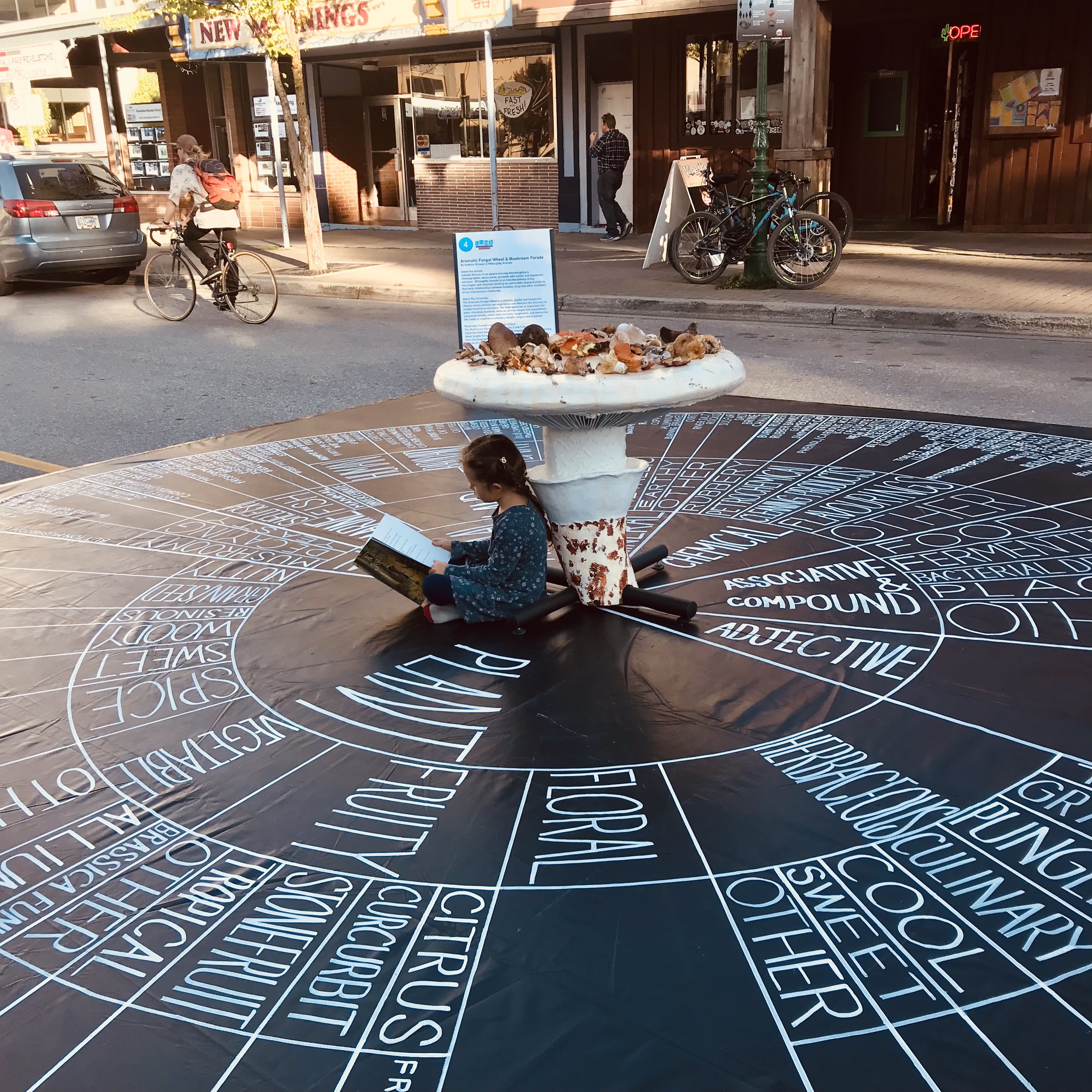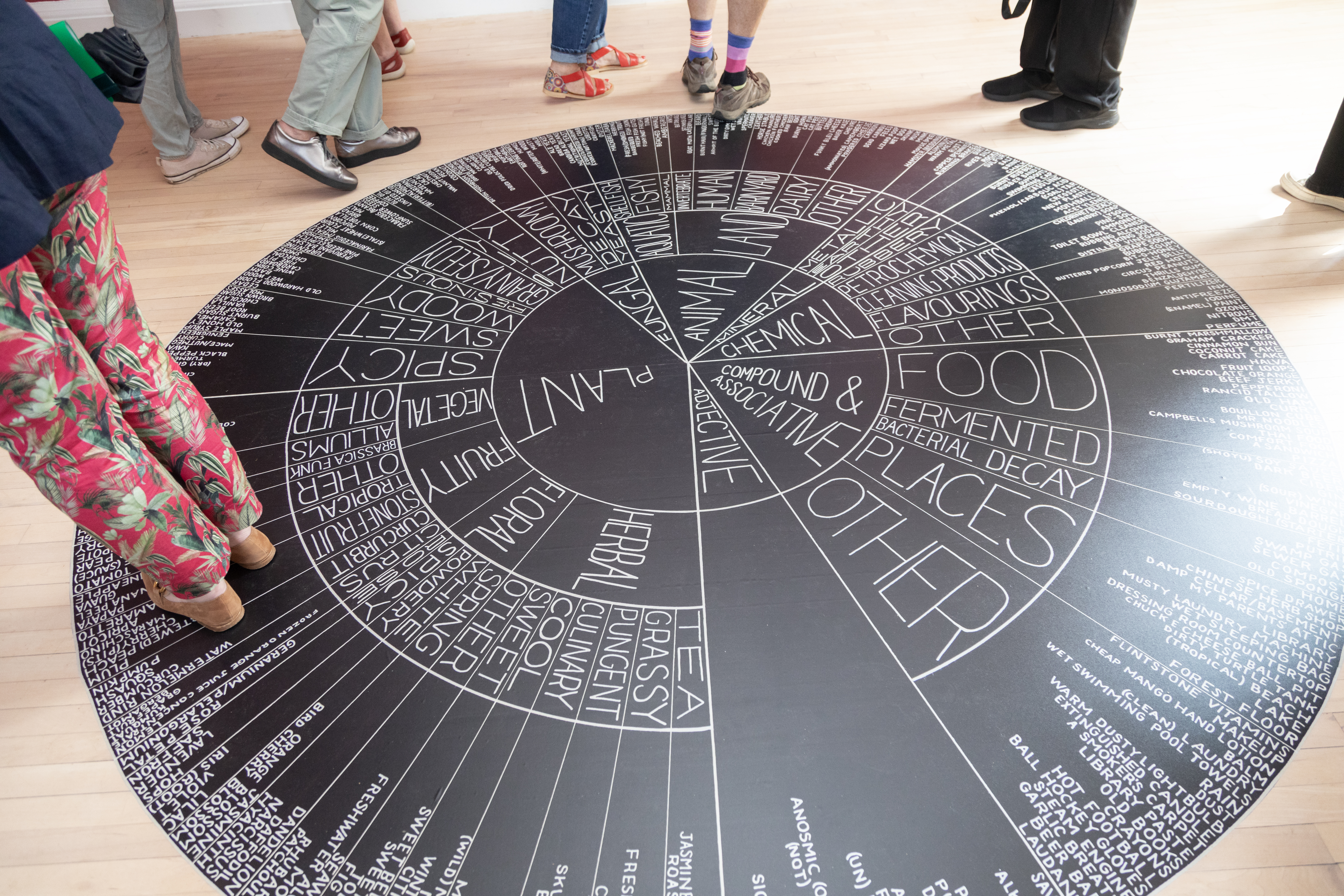 Our wheel has expanded to a large 20’x20′ immersive installation that includes 300 smell descriptors and fresh mushrooms displayed on a matsutake sculpture. This installation has been presented as part of Burnaby Blooms Festival and the LUNA Arts Festival in Revelstoke (2023). Our latest version, which includes 360 smell descriptiors, is about to be exhibited as part of Fungi Forms at the Royal Botanic Garden in Edinburgh, Scotland.