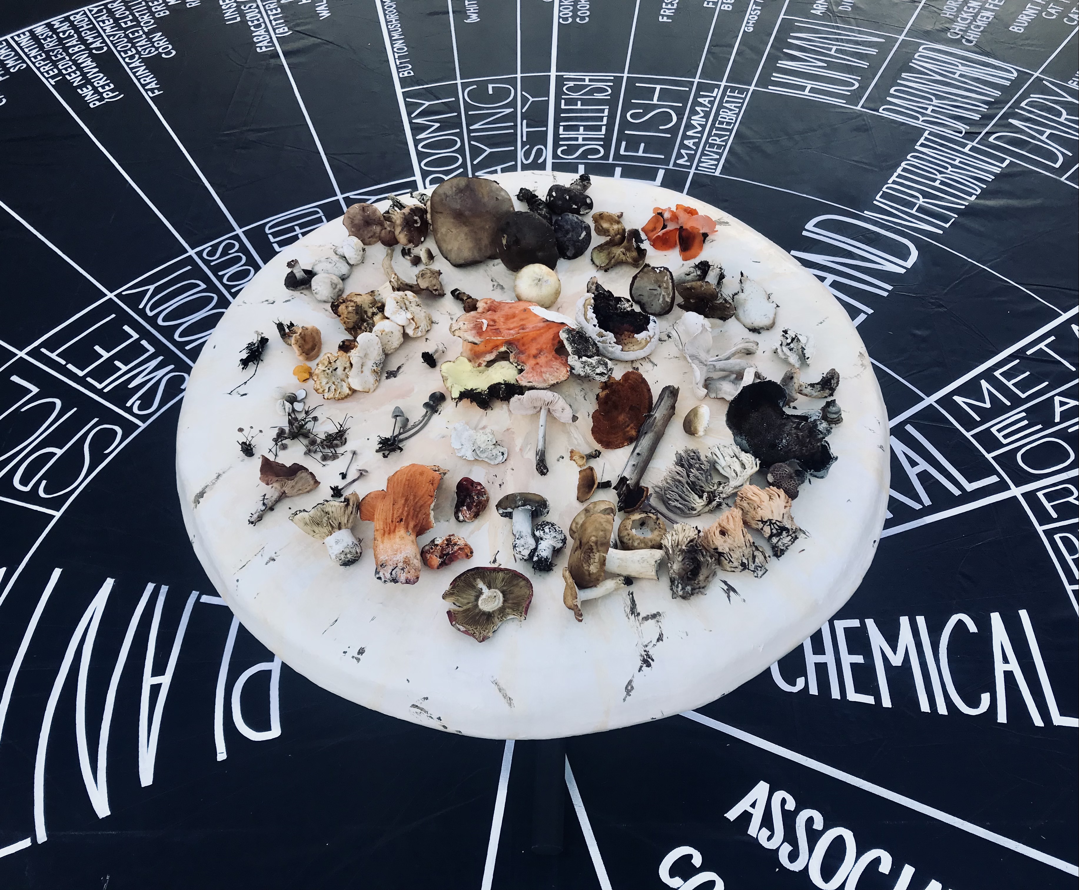 The first iteration of this wheel was created in 2018 as an art installation in residency at the Guapamacátaro Art & Ecology Center in P’urhépecha Territory/Michoacán, Mexico, where we drew the broad categories on a tablecloth. Rather than writing out each specific smell, we filled 44 small ceramic cups with the reminiscent substances, ranging from iodine to radishes to rubber bands, for participants to smell, optionally blindfolded. We have since made another cloth version, which you see replicated here. We often share it through a playful activity, inviting participants to smell mushrooms, discuss their aromas, and place them on the wheel. We have facilitated this experience with participants on mushroom forays, in schools, in community art projects, and at mushroom festivals such as the New Moon Mycology Summit (Mohawk Territory/New York, 2019 & Abenaki Territory/Vermont, 2023), and the Sunshine Coast Mushroom and Seaweed Festival (Shíshálh Territory/British Columbia, 2019).