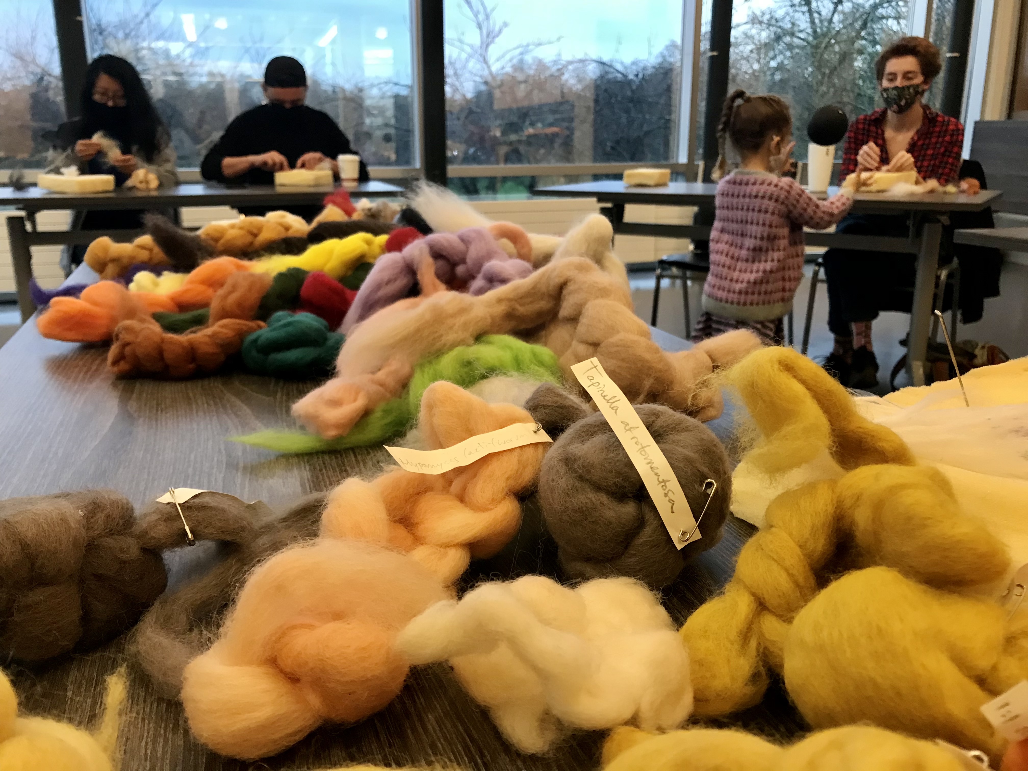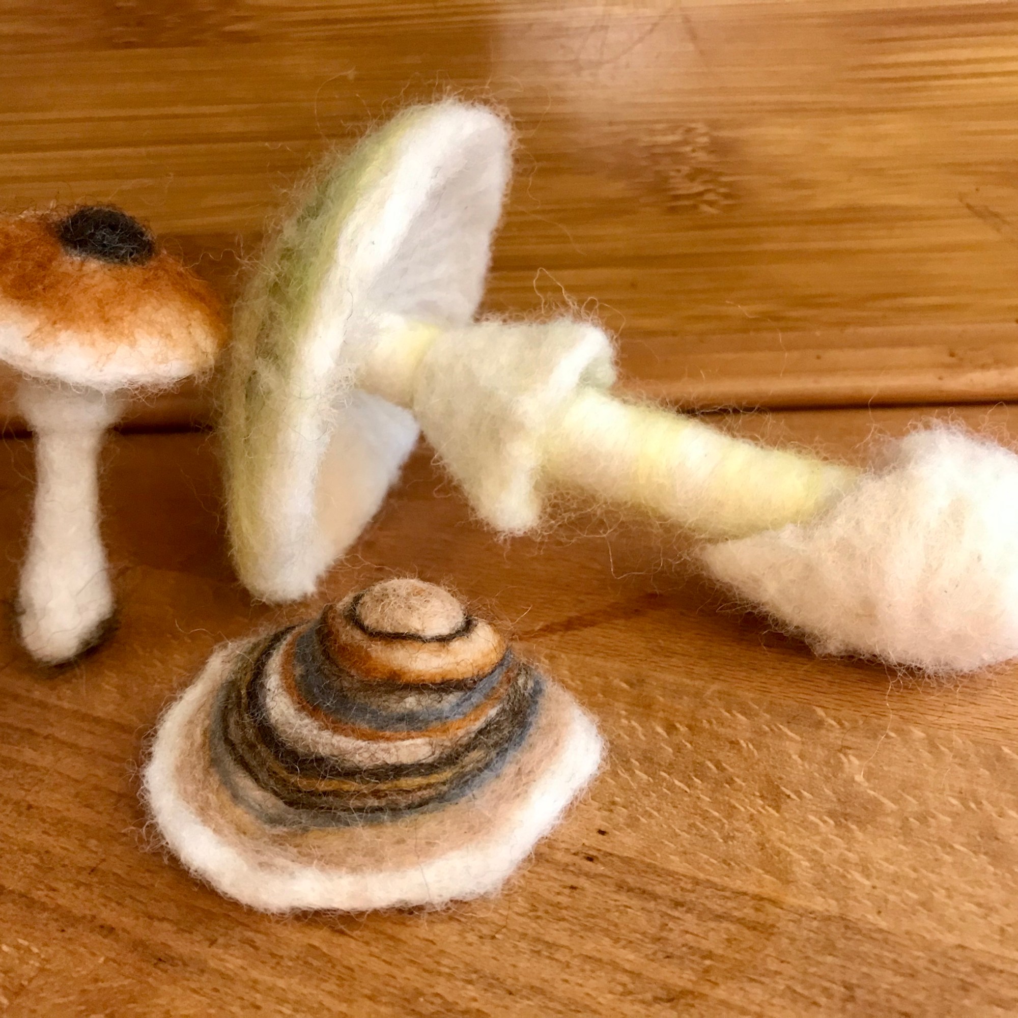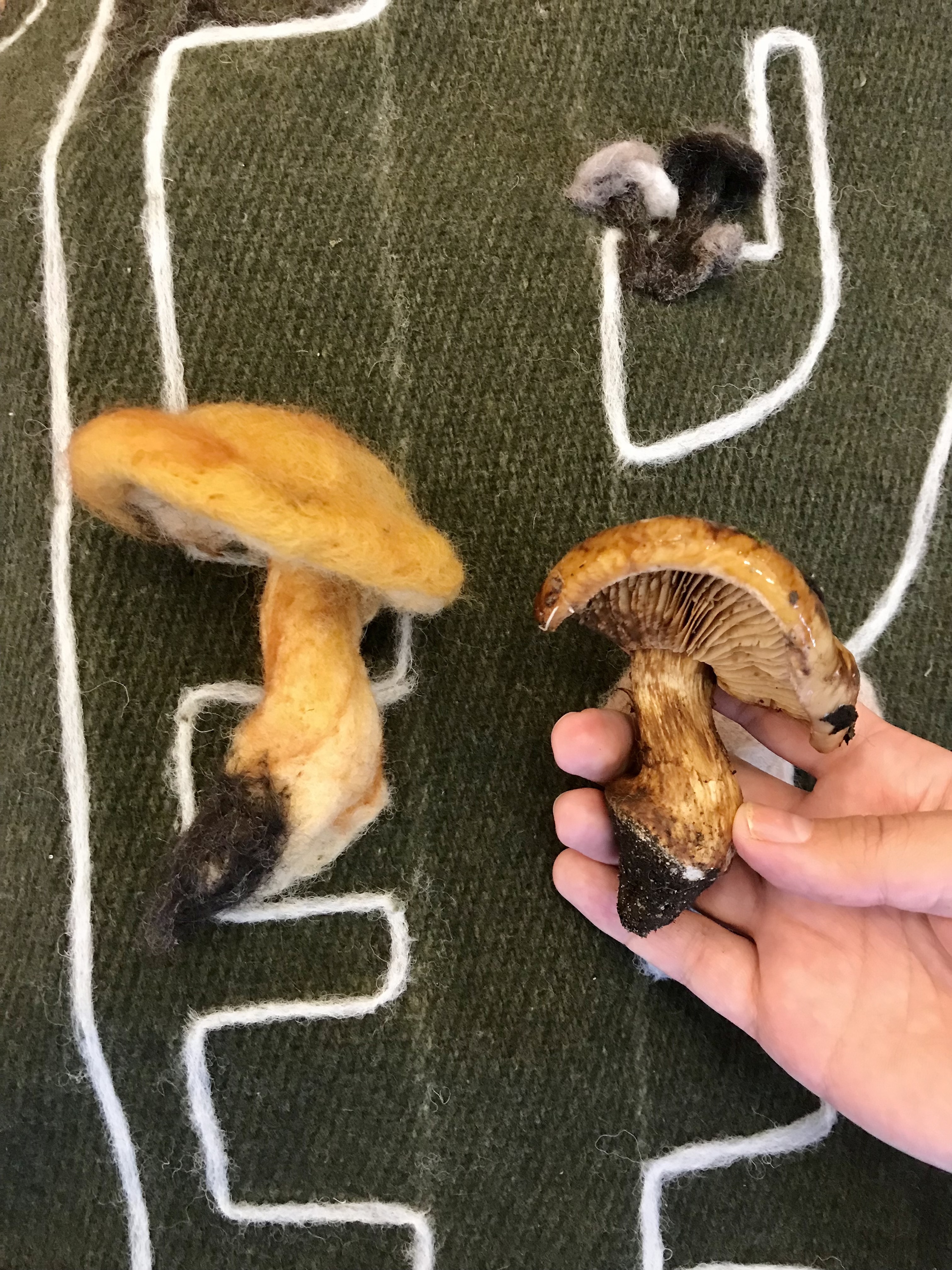 We are grateful to have been sharing this rainy day with a wonderful group of mushroom enthusiasts, needle felting wildly diverse fungi with wool over lively conversations. Crafted local species included the famous Fly Agaric (Amanita muscaria), a few Russulas (R. queletii, R. sanguinea), Boletus zelleri, the delicious Pacific Golden Chanterelle (Cantharellus formosus), Laccaria amethysta-occidentalis, and many more.