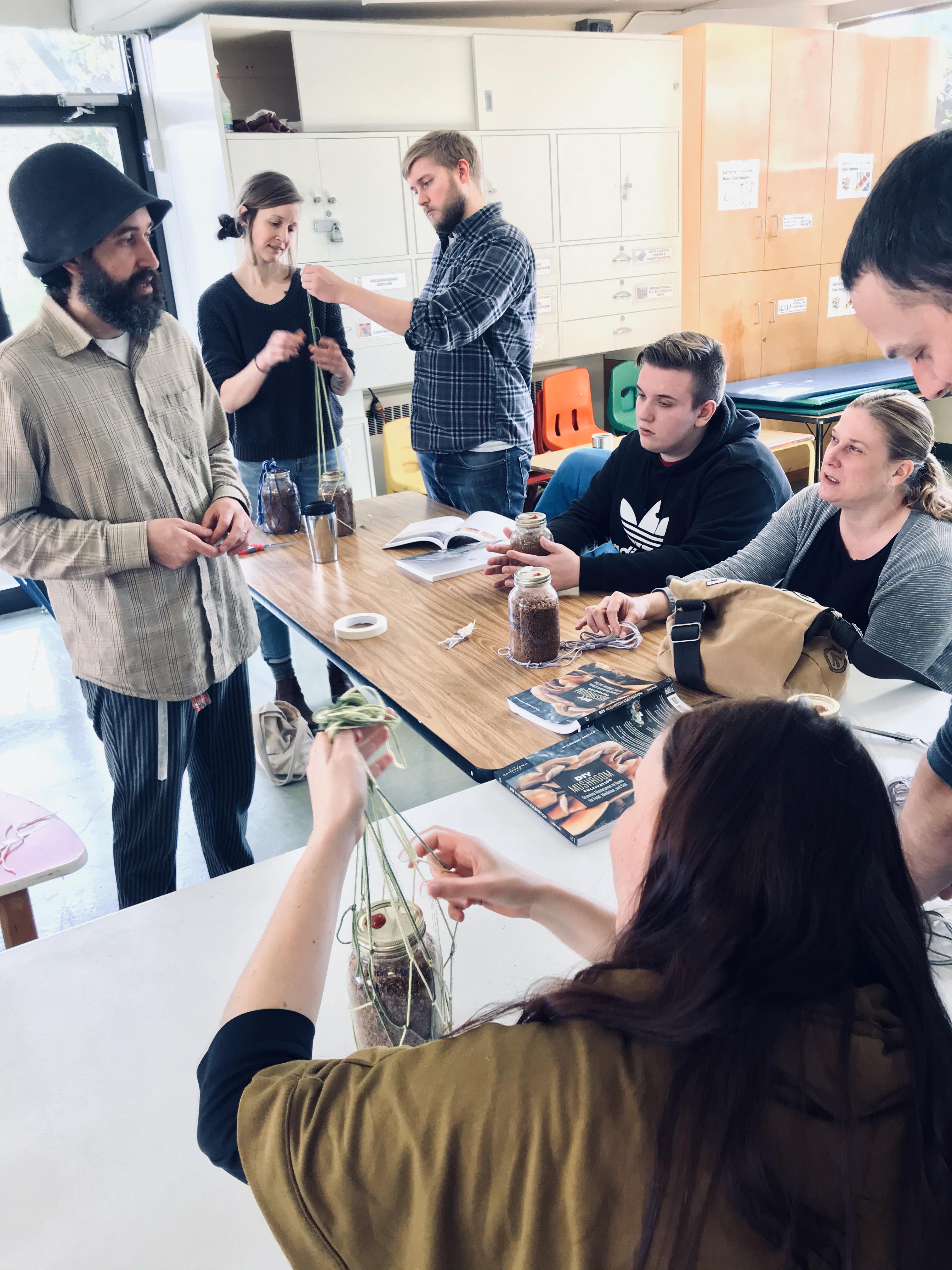 We spent this crisp morning crafting and sharing DIY mushroom cultivation techniques with an attentive group of mushroom lovers. Each participant chose a mushroom culture (turkey tail, oyster, lion’s mane, nameko, or luminescent panellus) and inoculated a jar filled with sterilized sawdust substrate. From there, they learned simple knotting techniques to create their knotted hanging mushroom jar. They took their jar home and will observe their fungi grow and fruit over the next few weeks.