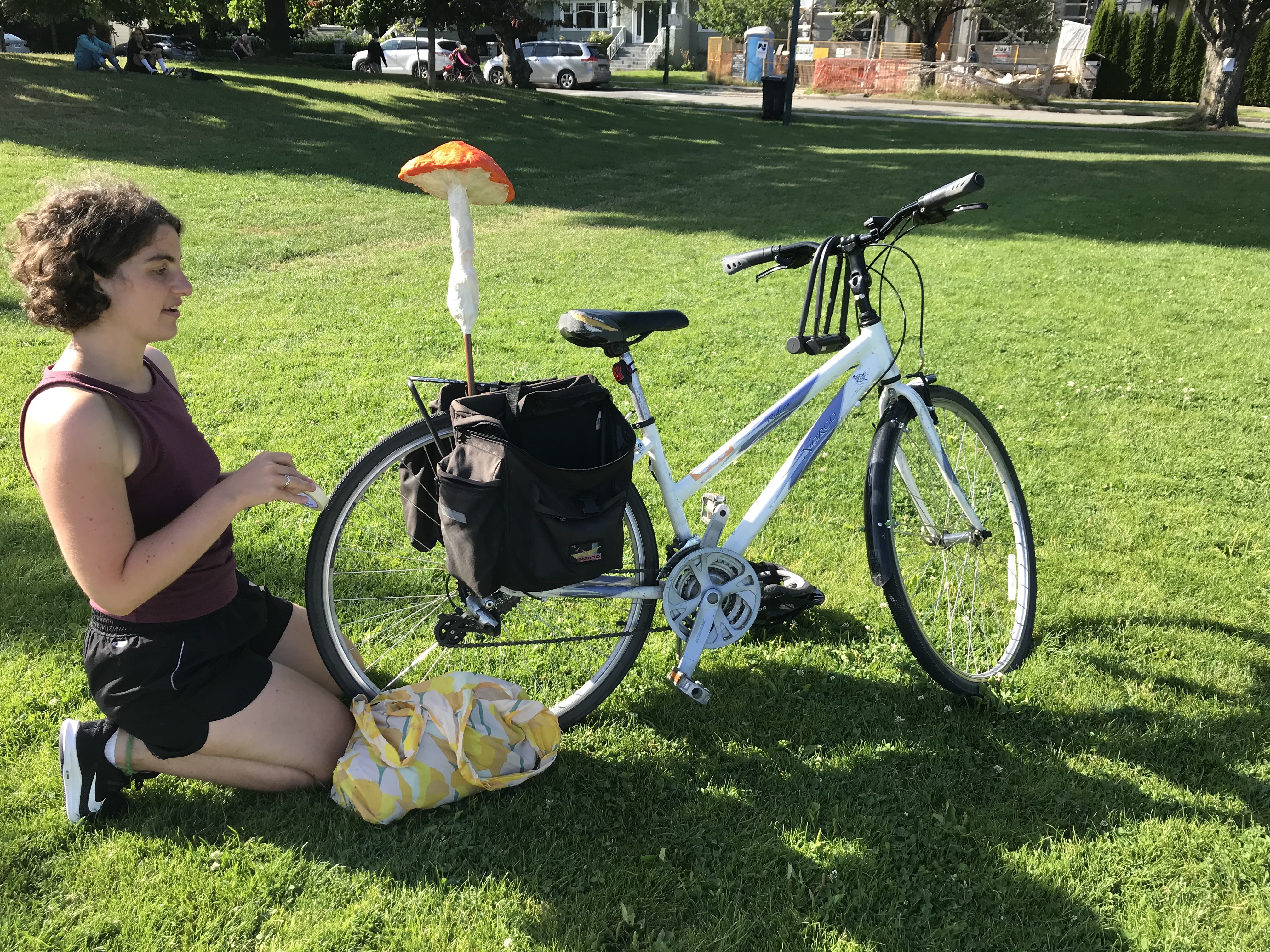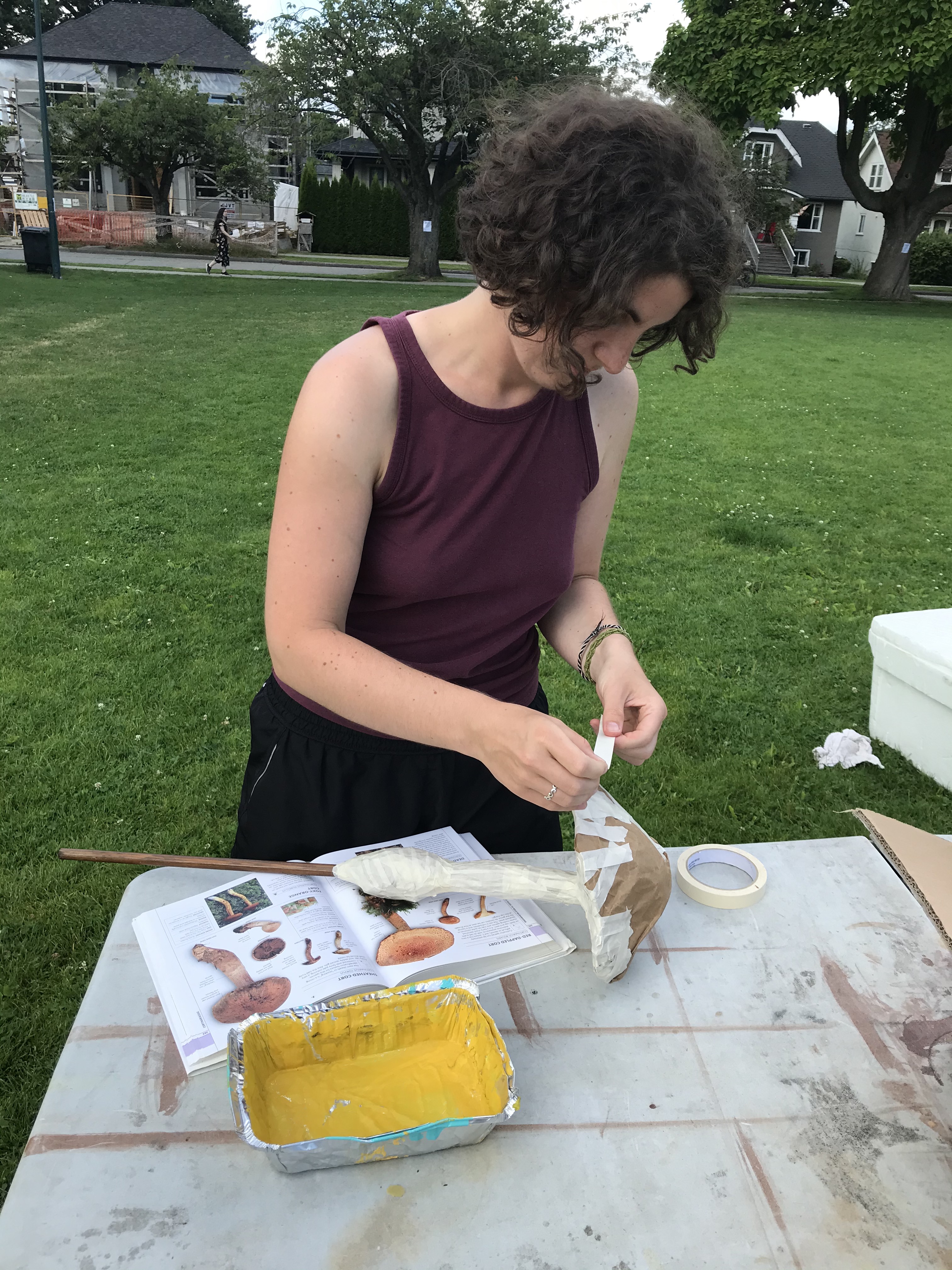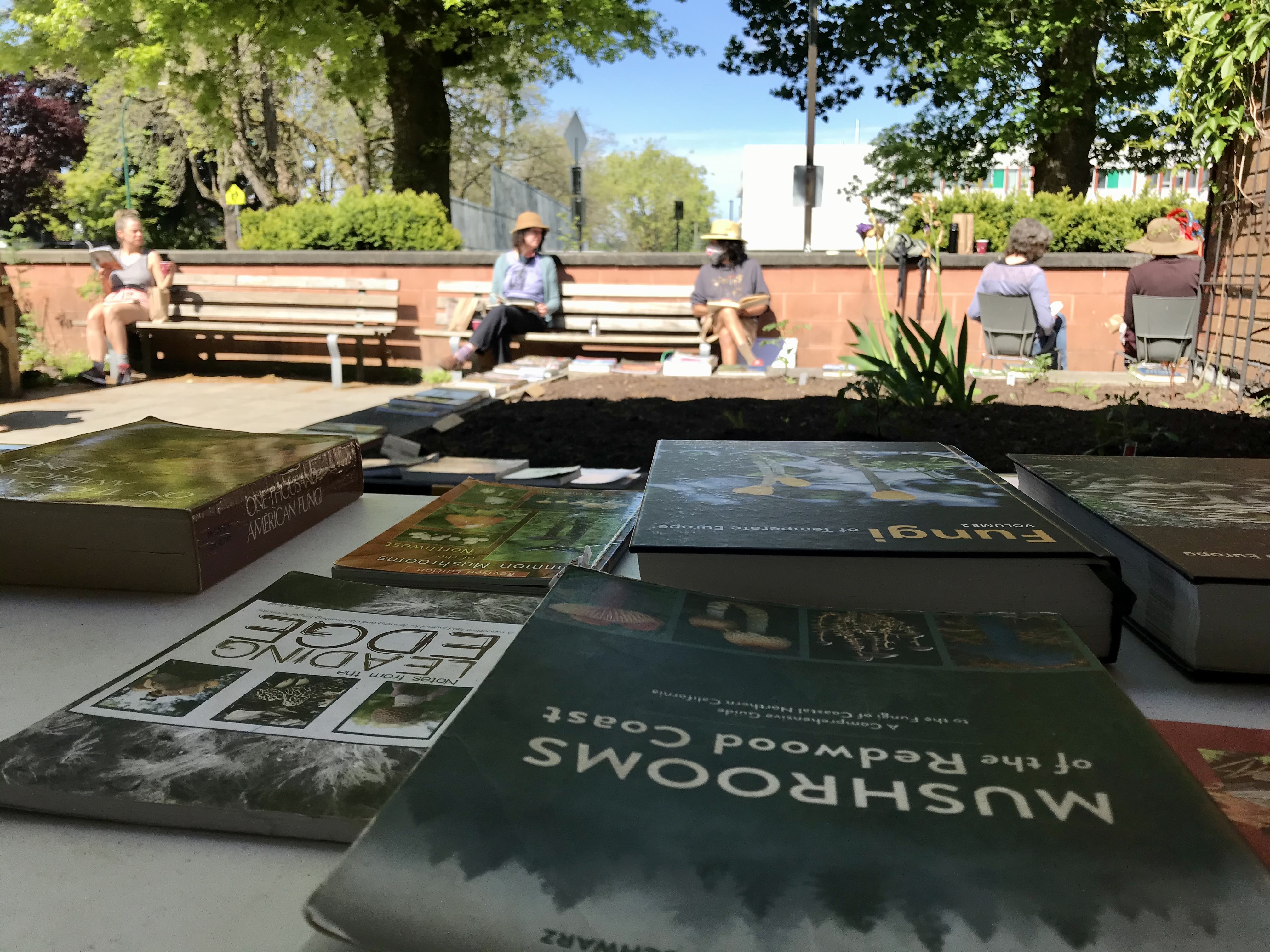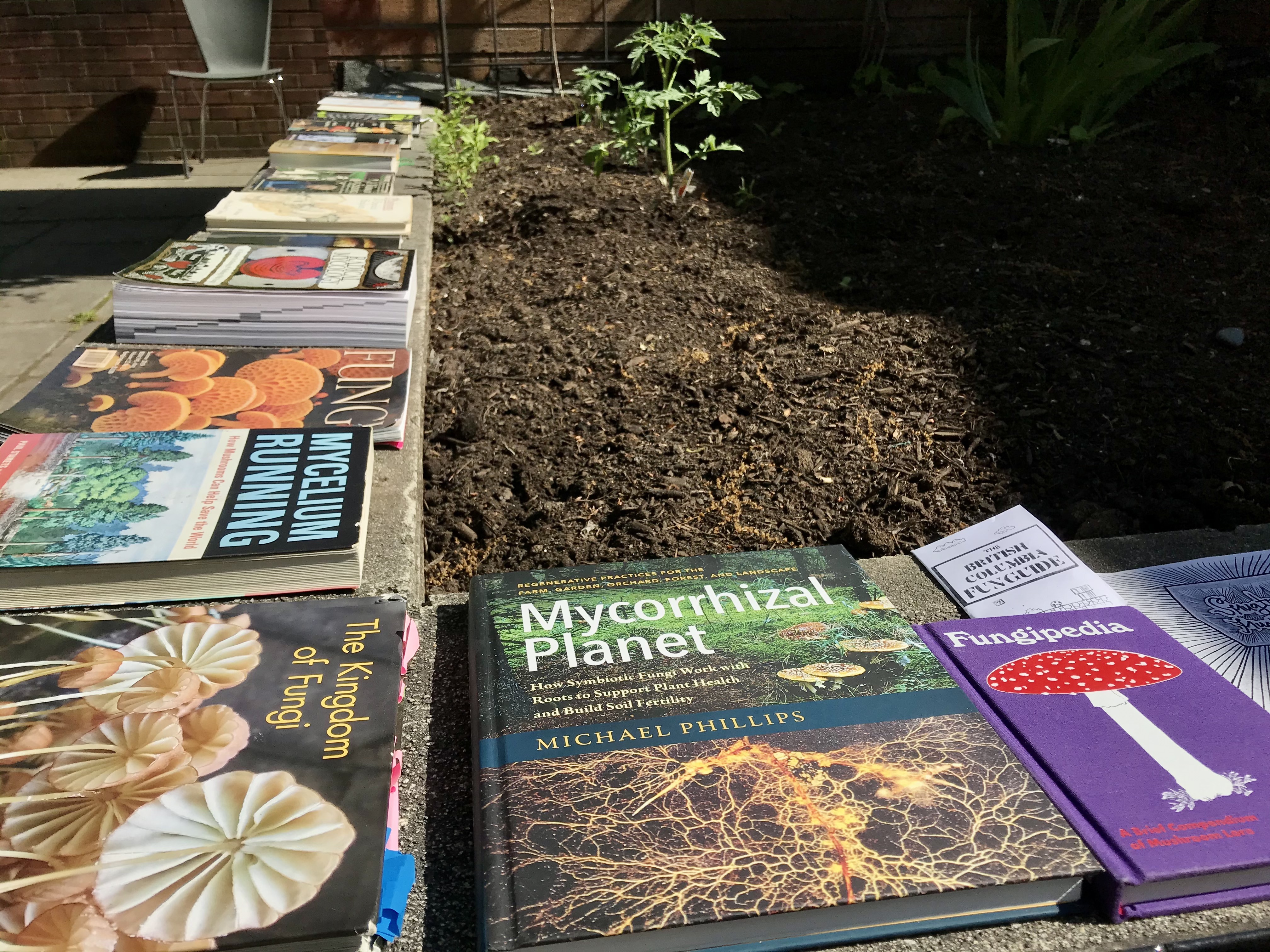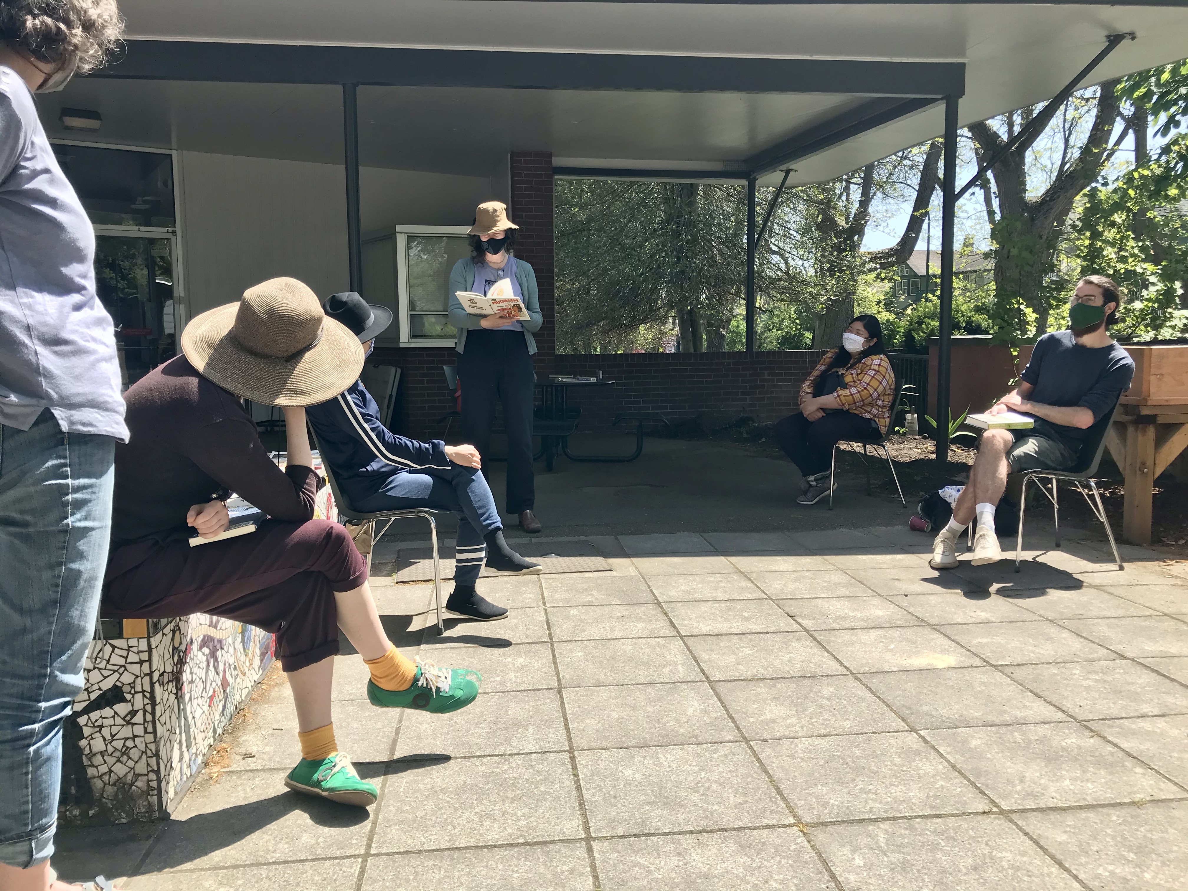 A lively group of us gathered outside of the Kitsilano Community Centre to spend some time reading together. We bought our collection of books about fungi, art and ecology to share with everyone. After soaking in the words under the bright sun, drinking some chaga tea and eating delicious porcini-seasoned popcorn, we had a conversation about what we learned and what sparked our curiosity during our reading session.