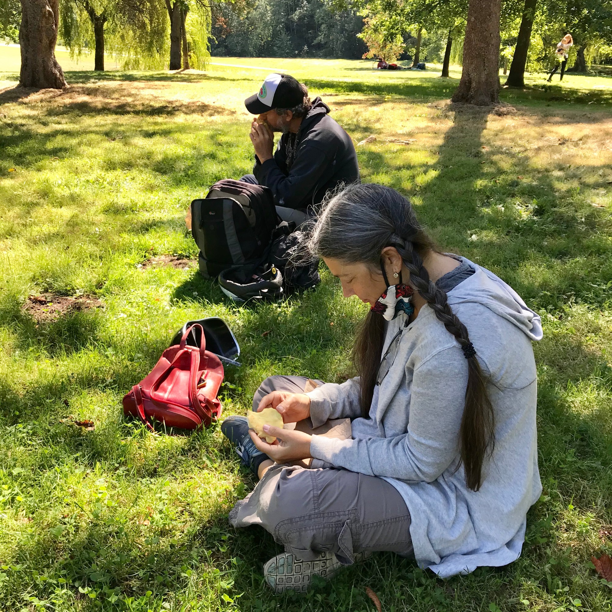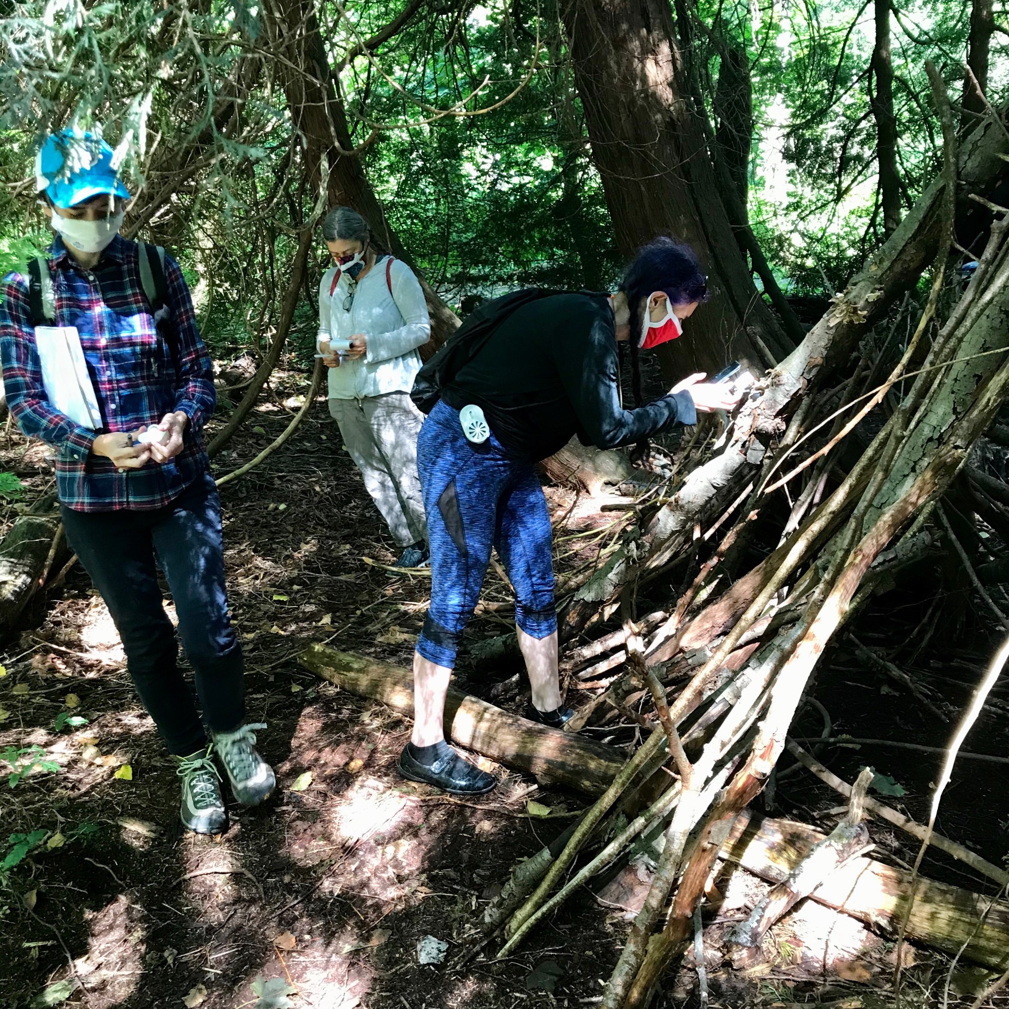 We gathered at Jericho Park West to learn from the land. It is a site with many stories, having been the Musqueam village of Ee’yullmough, then stolen to become a logging camp, a golf course, an air force base, and now a park. We exercised our observational skills as we read a long, narrow strip of land, noticing plants, fungi, invertebrates, birds, the qualities of the soil, seasonal indicators, the interplay of host species and guest species, and the traces of human activity. This session was greatly influenced by my mentor and friend, radical ecologist Nance Klehm (socialecologies.net), and the practices she shared with me of land reading and of deep mapping, which was conceptualized by writer and historian William Least Heat Moon.