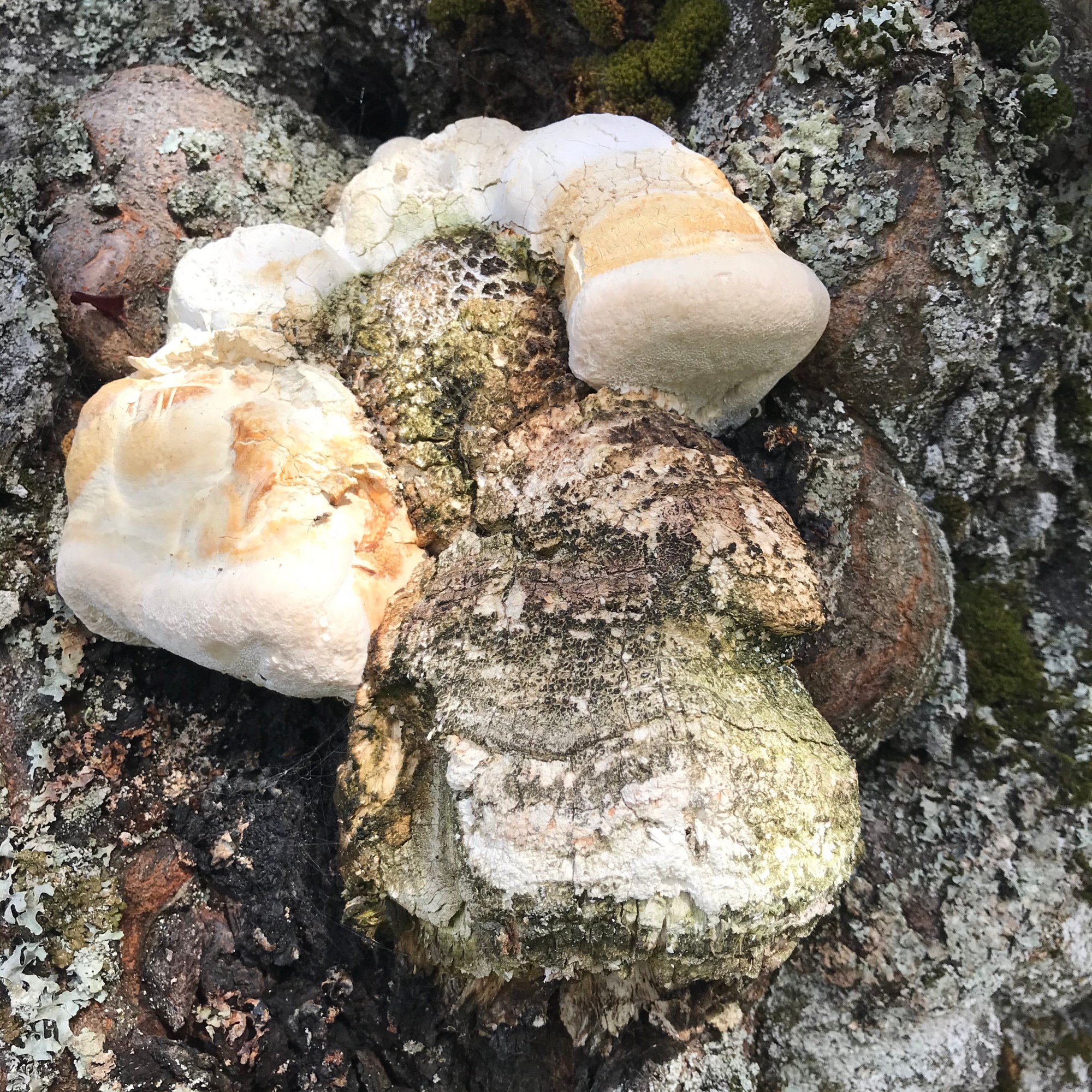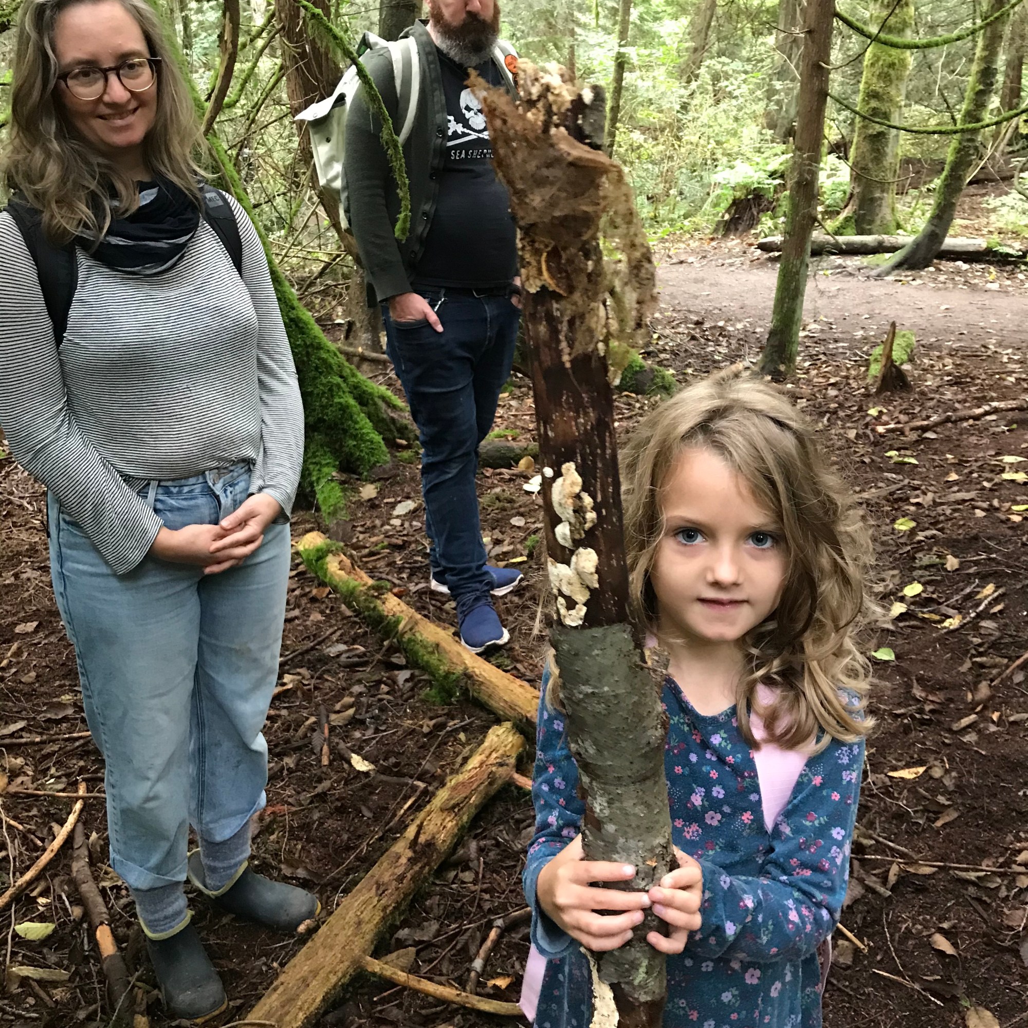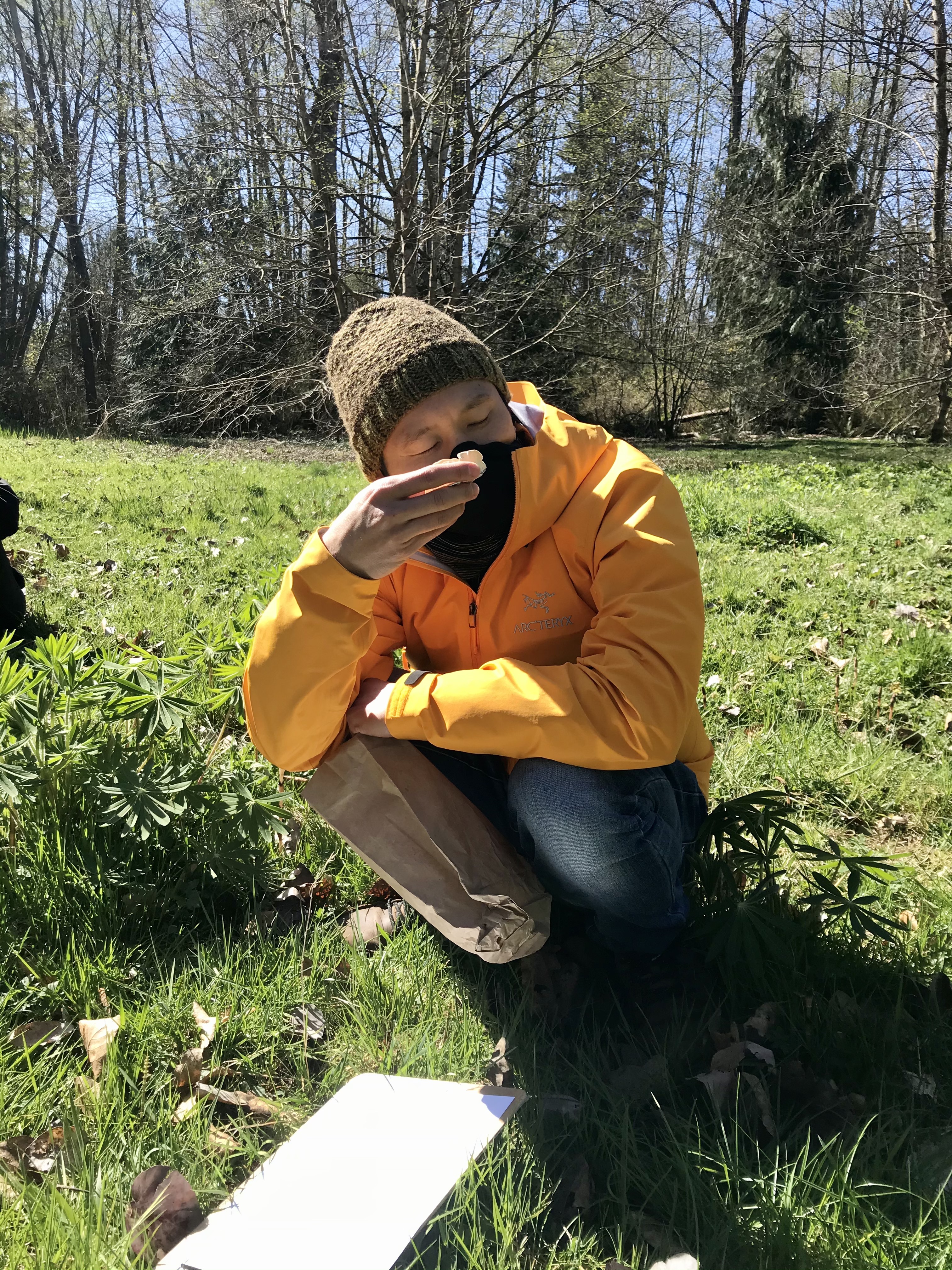 This windy day, we returned to Jericho Park West, to deepen our relationship with that land. The birds were so present and active as we observed fungi and discussed their relationships with trees and humans. Practically all of the fungi we encountered today are parasites or saprotrophs decomposing live or dead wood. In this young, early-succession forest with a canopy of mostly fast-growing broadleaf trees, there are few mycorrhizal mushrooms (most of which would fruit in fall anyway). I realized today that the young conifers that have been transplanted by the Jericho Stewards lack common mycorrhizal networks with their elders, whom would have all been cut down about 160 years ago. These baby trees are like so many of us (settler/immigrant) humans – transplanted and without unbroken connections between us and our ancestors and ancestral lands. Who will teach us how to live in relationship? Who will nurture us as we grow? Fortunately, mycorrhizal fungi can nuture, share and teach across species lines.