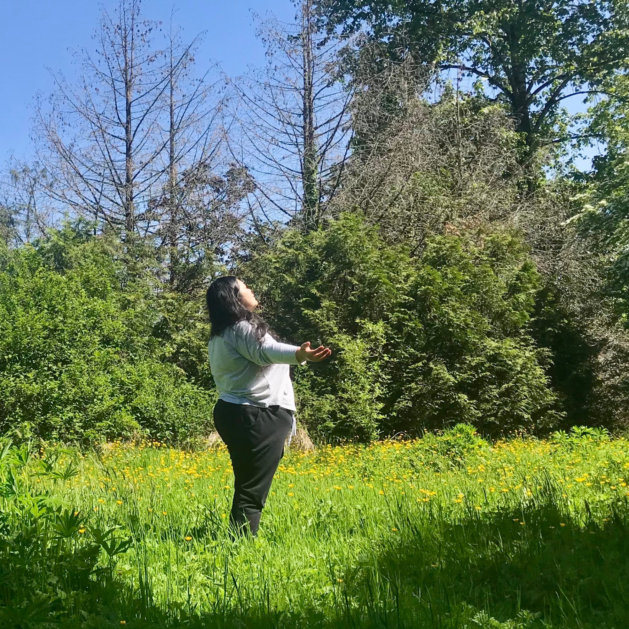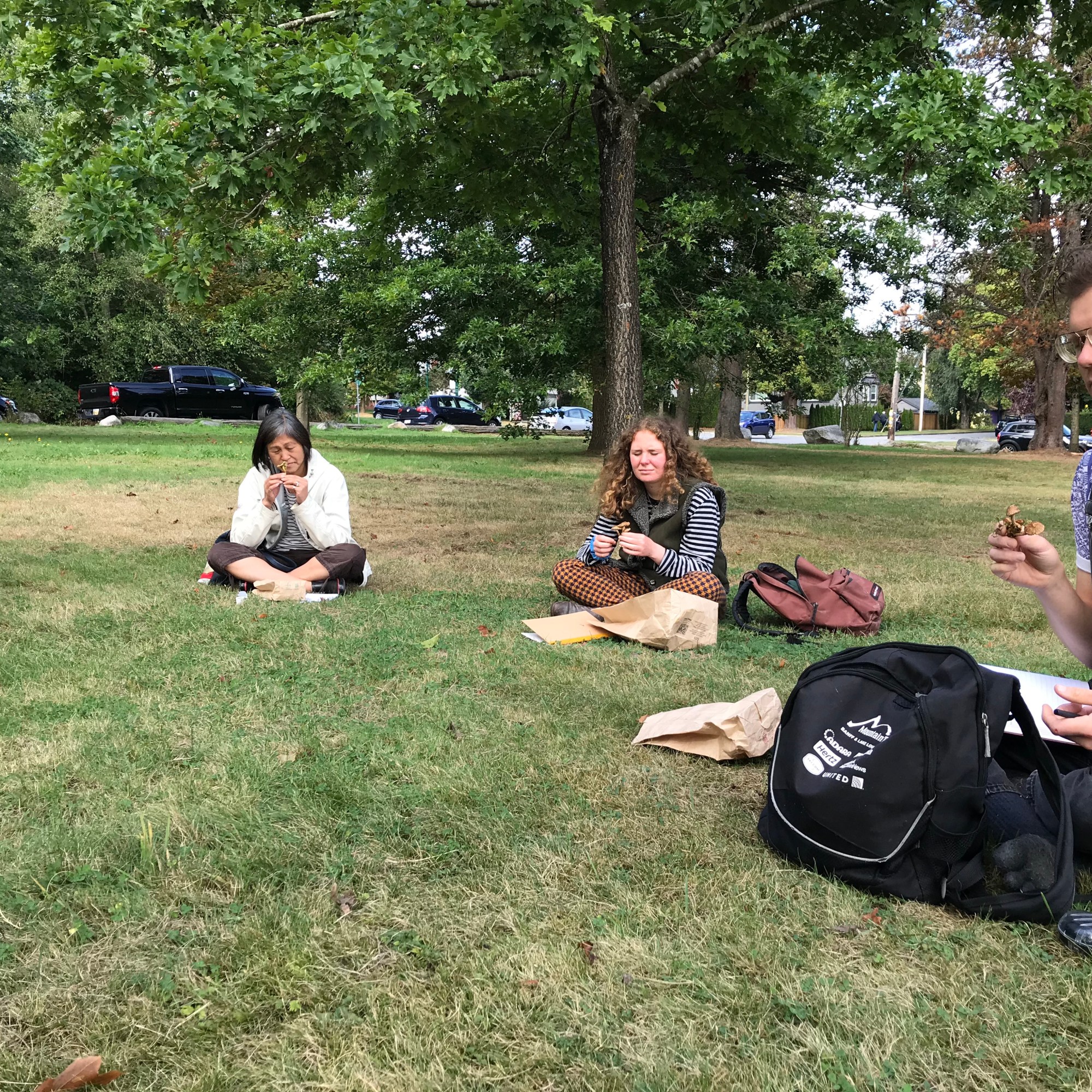 This weekend, a diverse group of new participants and familiar faces joined our Forest Movement Practice under a few Douglas firs in Jericho Park. The air smelled as sweet as Nootka roses. Beside a large cluster of inky cap mushrooms by the side of the road, we didn’t observe much fungal life, but noticed the growth and liveliness of many plants. After spending some time listening, and tuning into our senses, we walked slowly and moved with eyes closed, responding to the land and its more-than-human inhabitants. One of the participant said: “I connected with nature in a way that they haven’t experienced since my childhood”.