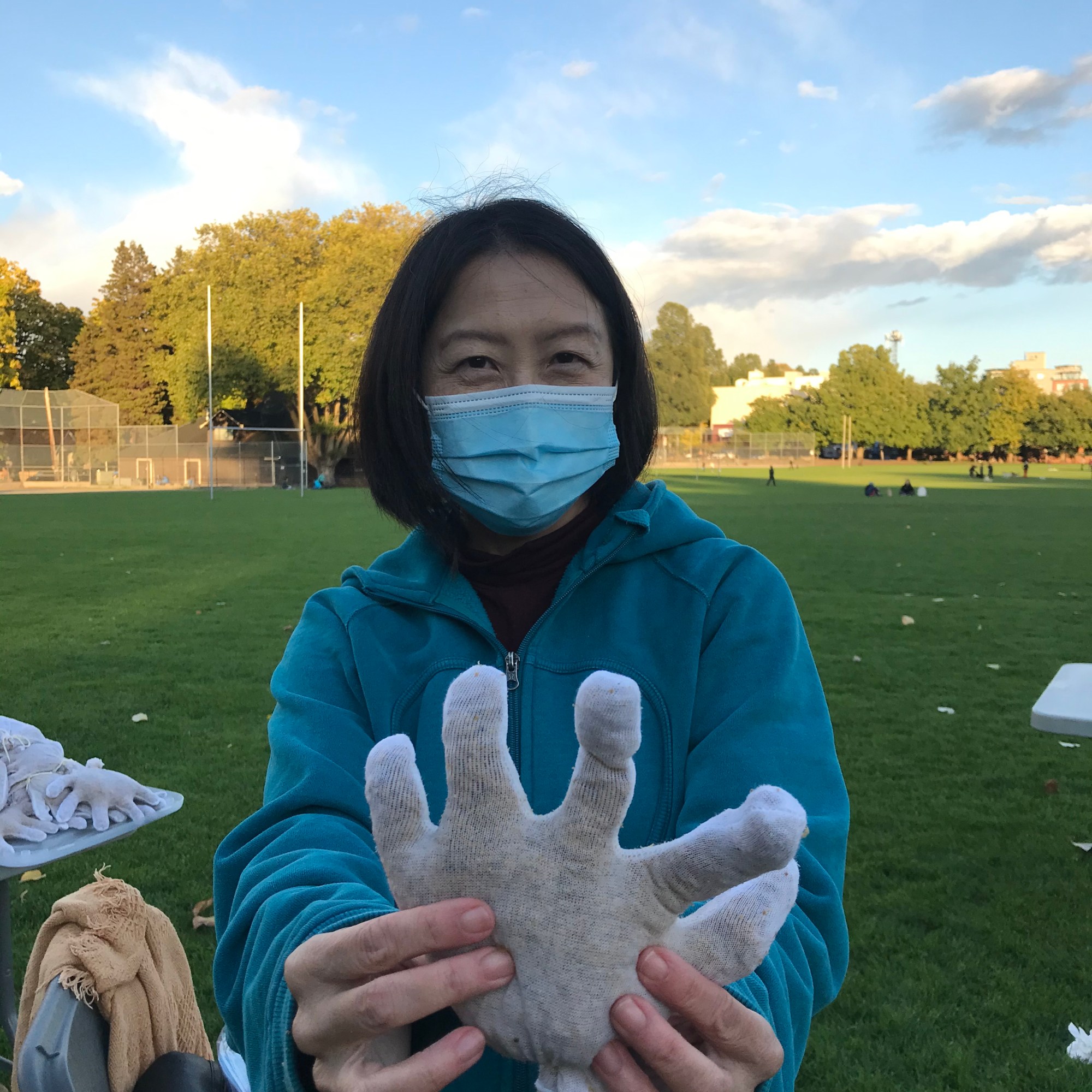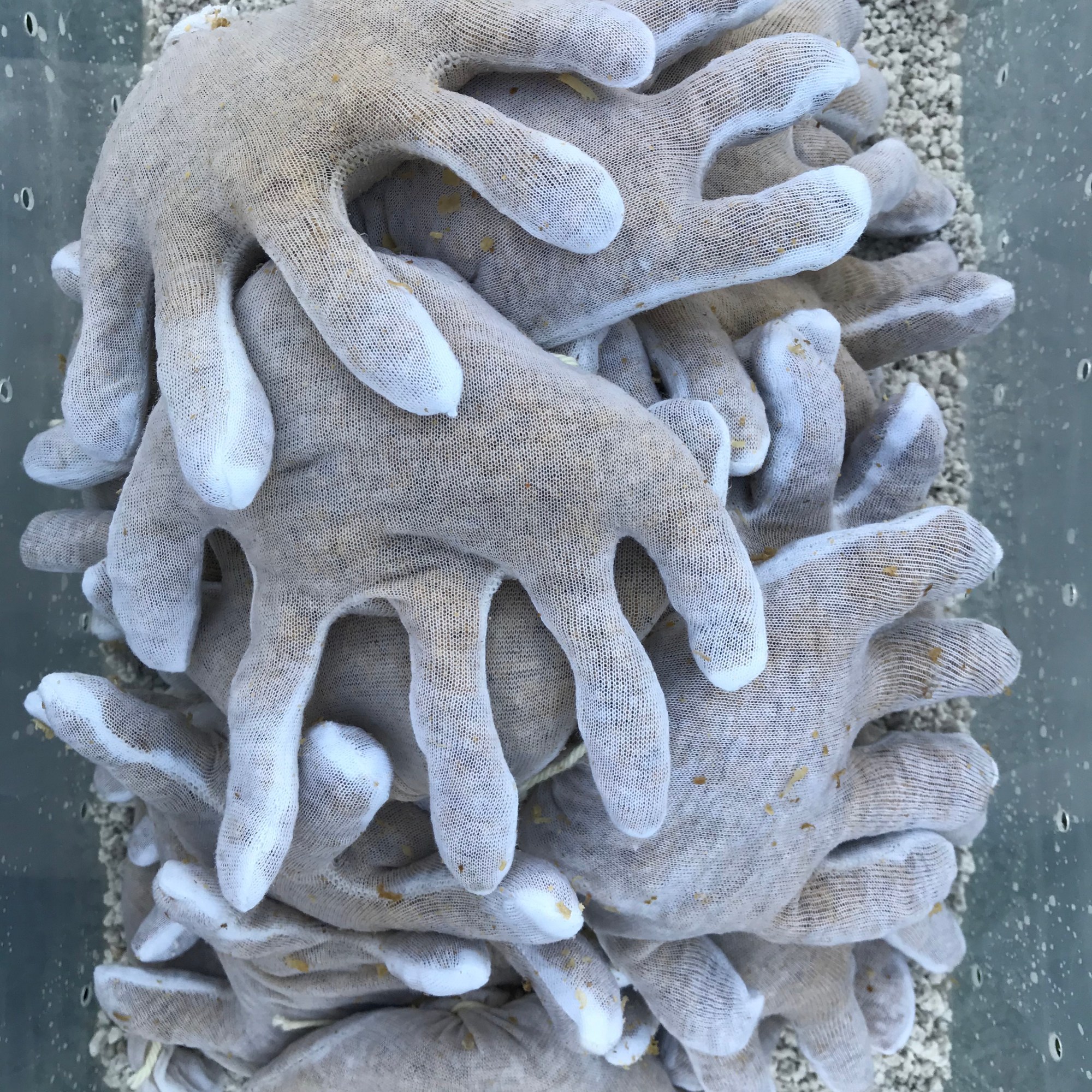 A lovely group gathered in the autumn sun to learn basic mushroom cultivation skills while creating hand elements and composing a collaborative, living sculpture. We filled cotton gloves with oyster mushroom grain spawn and pasteurized sawdust, placing them in a composition inside a transparent fruiting chamber. The session was filled with engaging discussions on how fungi sense their worlds, communicate, eat and grow. The sculpture will be photographed through its growth process and the images compiled into a short time lapse video and shared here once completed.