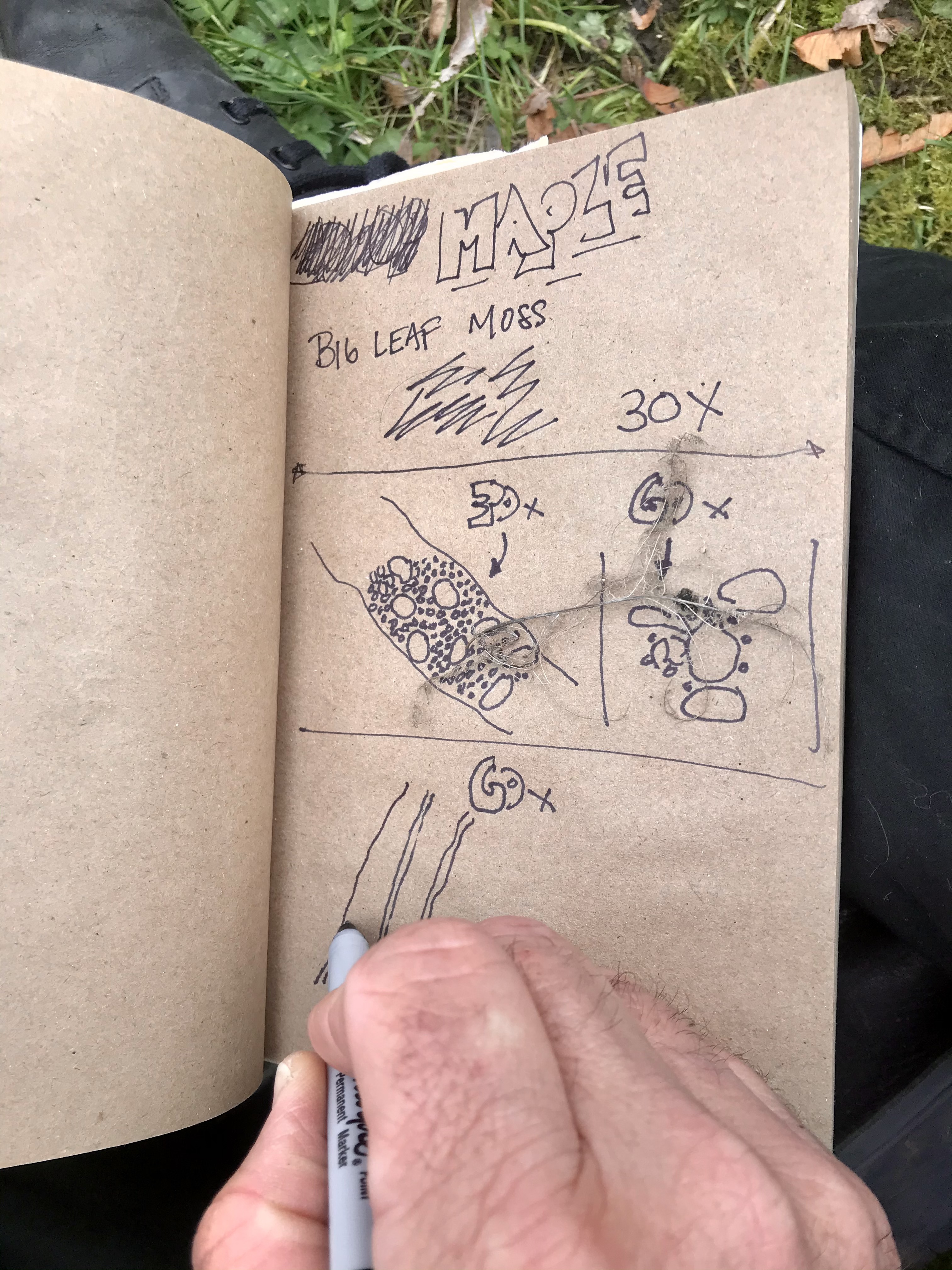 Today we joined together in a small group to observe and discuss fungi in Pacific Spirit Park. As we wove in and out of the edge of the trail, we observed many small wonders through 30x and 60x hand lenses, pondering cause and effect, parasitism and succession, symbiosis and communication, the richness imbued by language, and the false concept of the individual in an entangled world. We concluded with a sensory meditation with a surprise guest – a chicken of the woods mushroom.