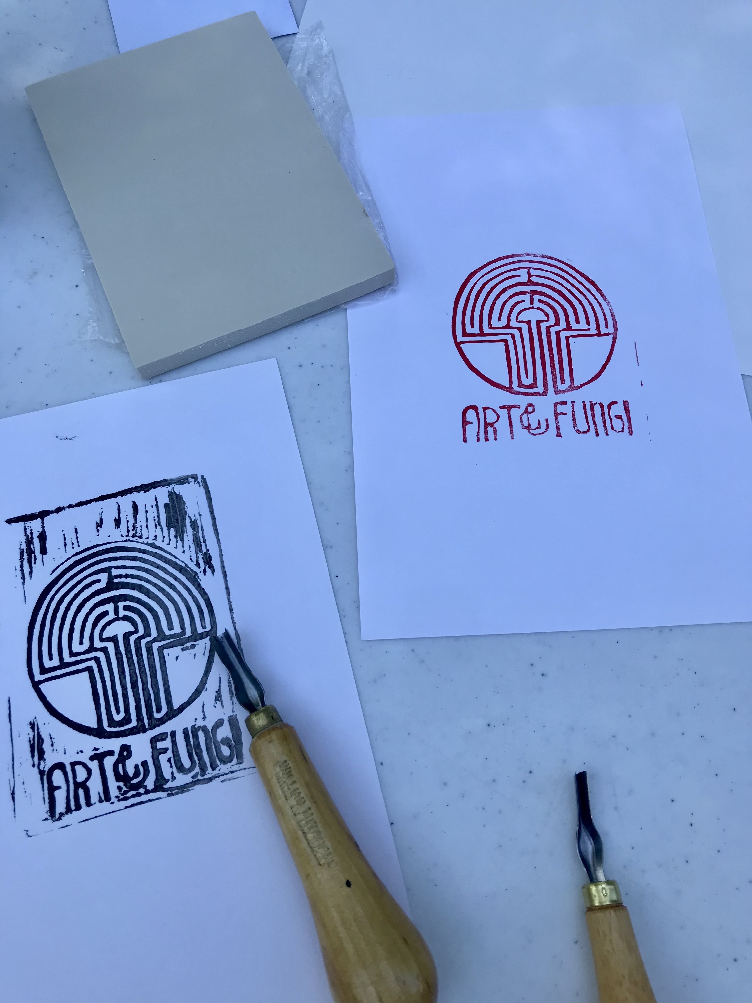 Taking insporation from a stack of mushroom books, we dug carving tools into rubber blocks and printed away! In the collective print sheet below, we have (clockwise from top): mycelium, Yellow Morel (Morchella esculenta), Mushroom Labyrinth, Agrocybe aegerita, Agrocybe dura, Fairy Ring Mushroom (Marasmius oreades). Mush gratitude to The Learnery for renting us the blockprinting equipment!
