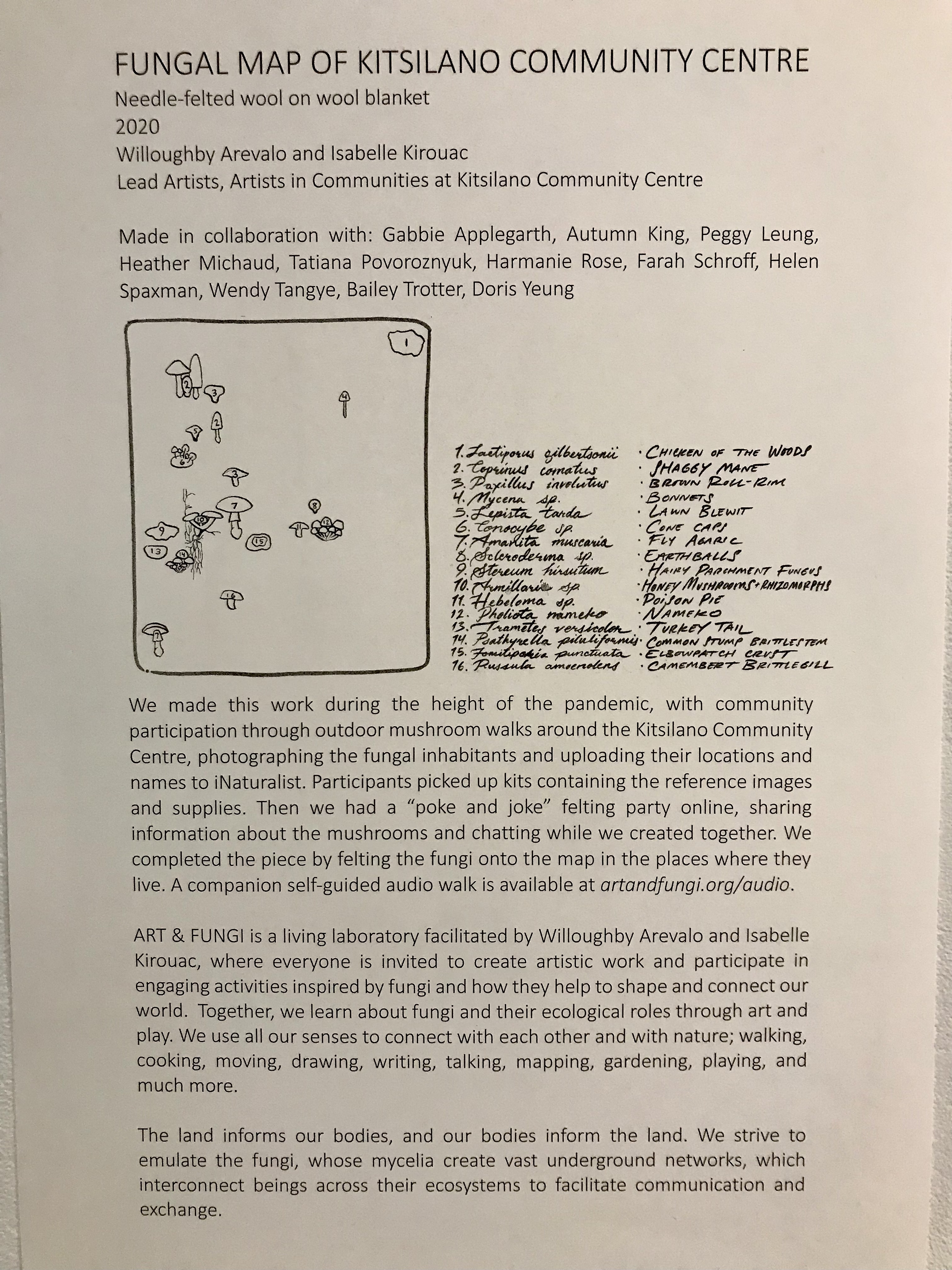 We are happy to announce that the felted fungal map is now completed and installed in the entrance of the Kitsilano Community Centre to be enjoyed throughout the winter! Using iNaturalist, community members reported sightings of mushrooms around the community centre. These mushrooms were then assigned to twelve different participants, who created wonderful needle-felted interpretations of them, contributing to this collective map.
