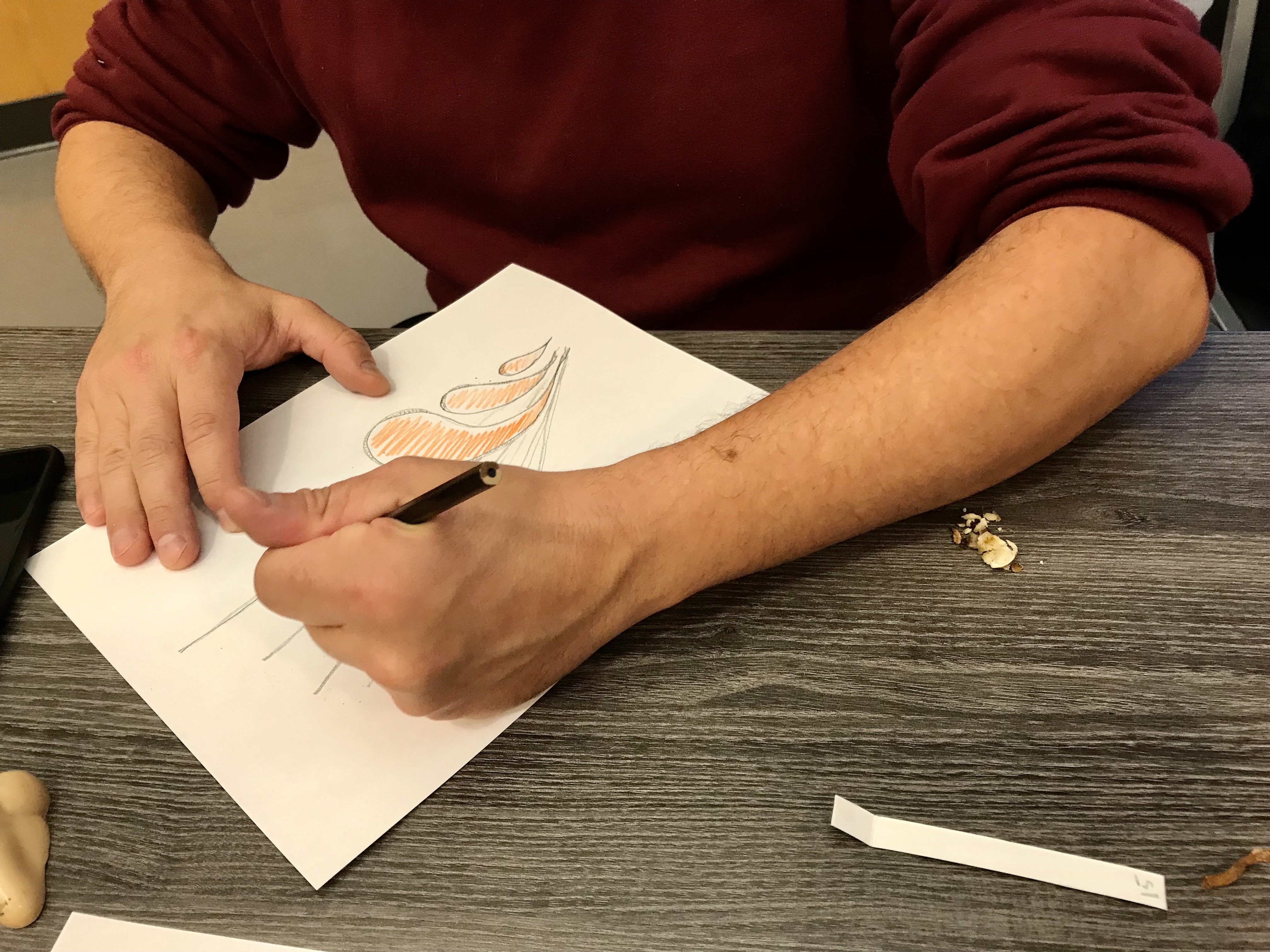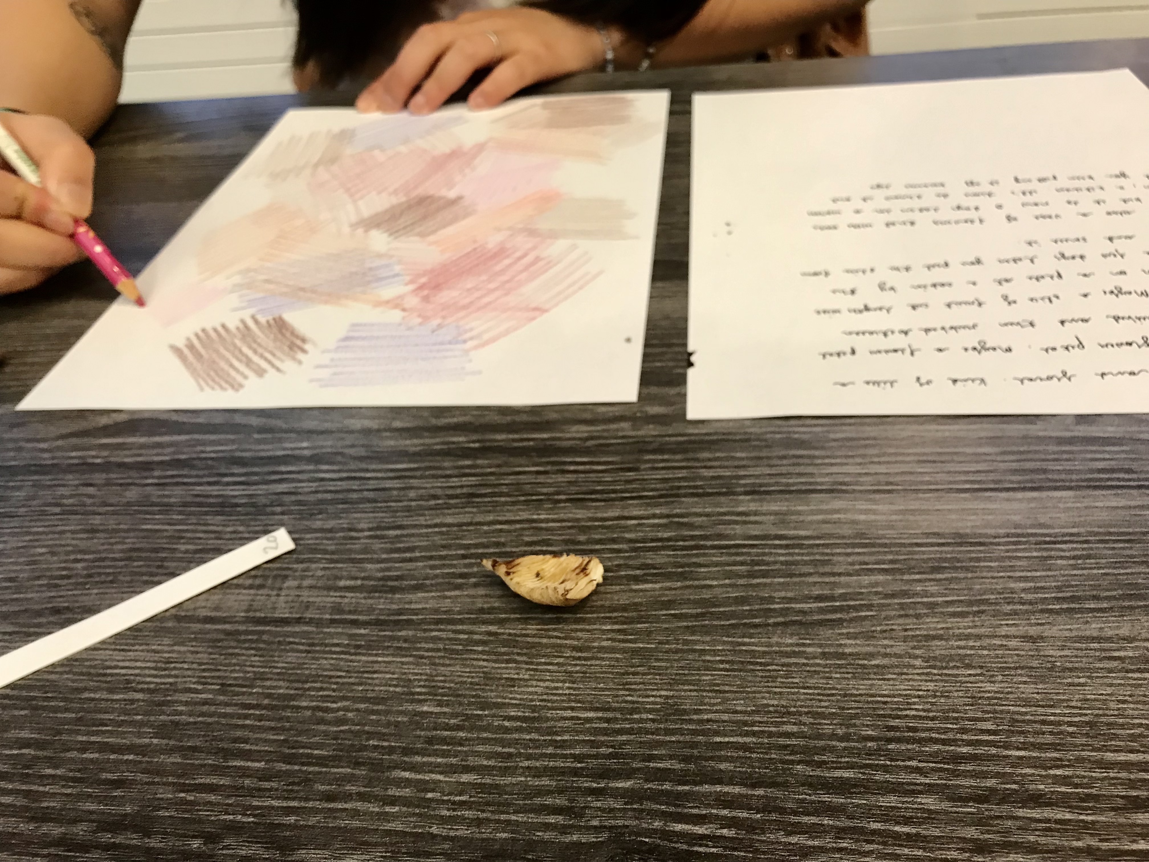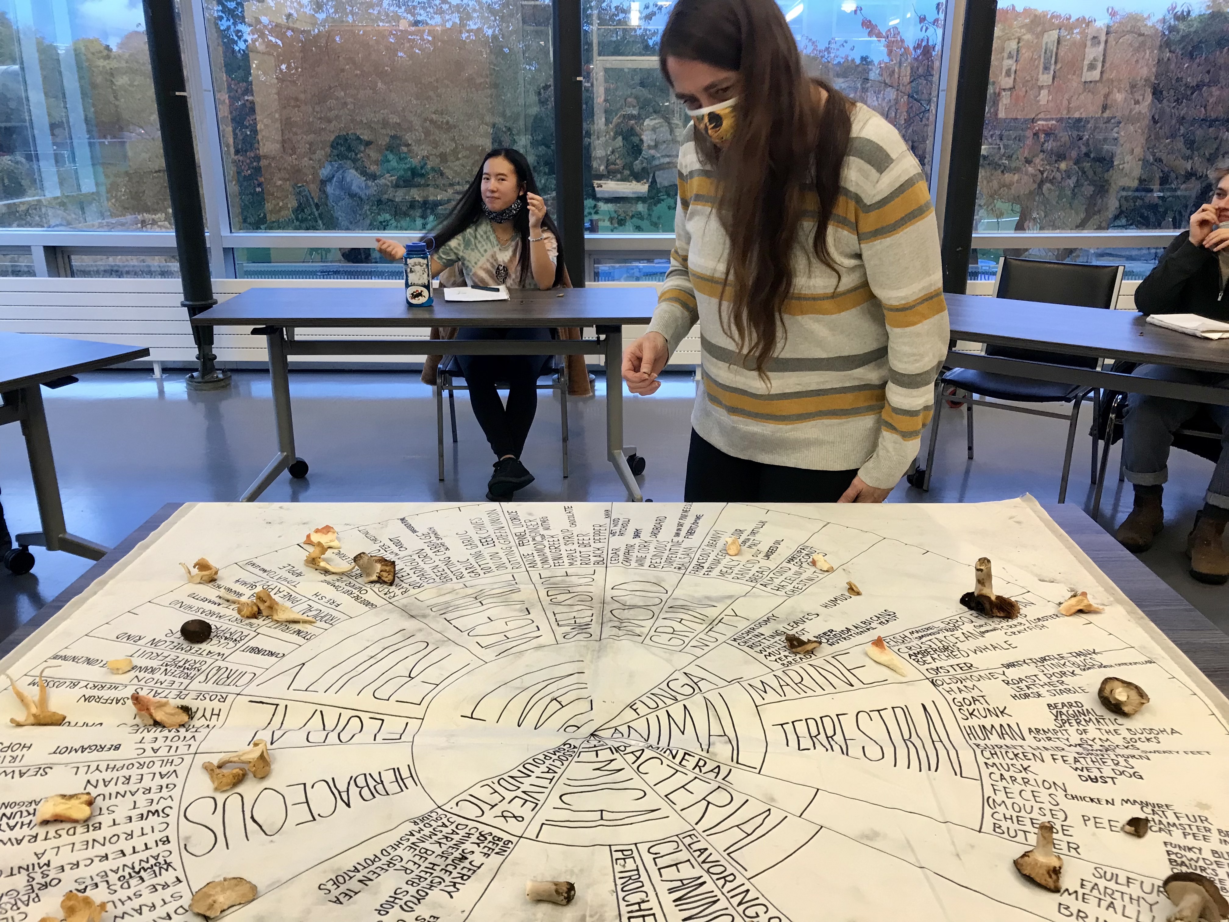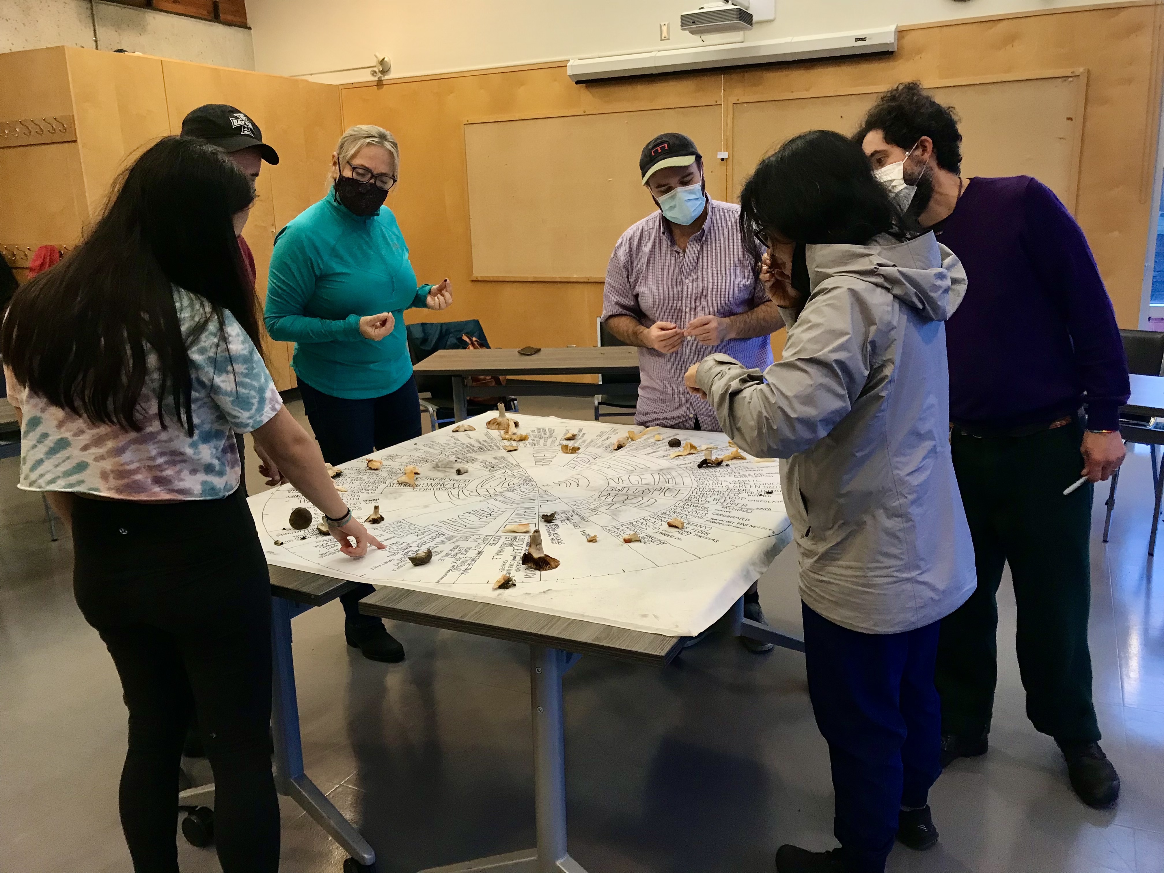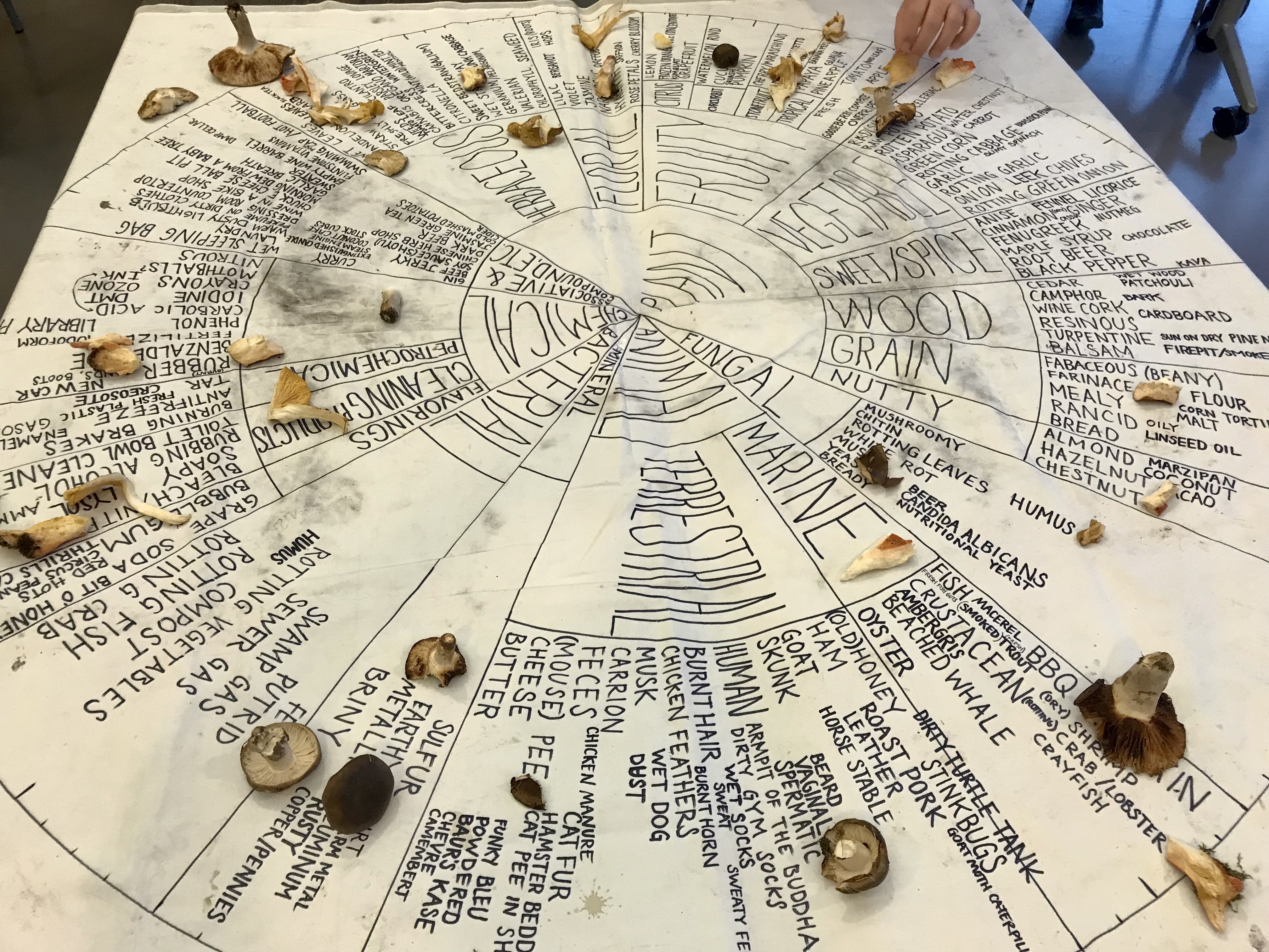 Today, a group of us gathered at the Kitsilano Community Centre for a fungi olfactory play time. We took a short walk outside the centre, bringing our noses to various surfaces to explore their scents and awaken our sense of smell. We encountered the aromas of tomato leaves, marigolds, garbage cans, wet concrete walls, dirt, sweet gum trees, crushed hedge laurel leaves, electrical boxes, and many more. On our way back, we offered a selection of uniquely fragrant mushrooms for the participants to smell. Discerning hints of fenugreek, earth, ozone, rhubarb, Mr. Noodles seasoning powder, walnuts, chalk, river silt, pine-sol cleaner, peaches, and more, the participants placed their mushrooms on an aromatic wheel of fungal smells created by Willoughby and Isabelle. To conclude our time together, everyone got a paper fragrance strip inspired by smells found in mushrooms to interpret through drawing and writing. Discussions were filled with vivid memories imbued with playfulness.