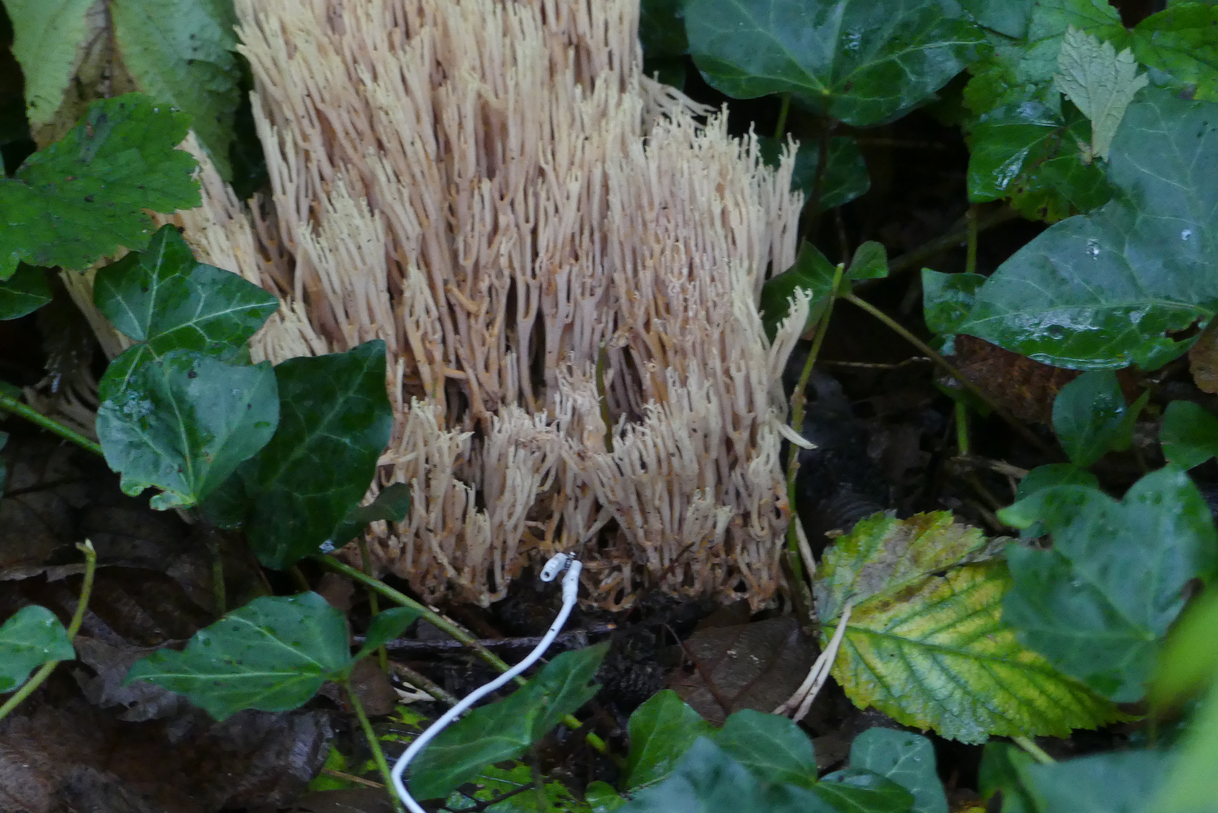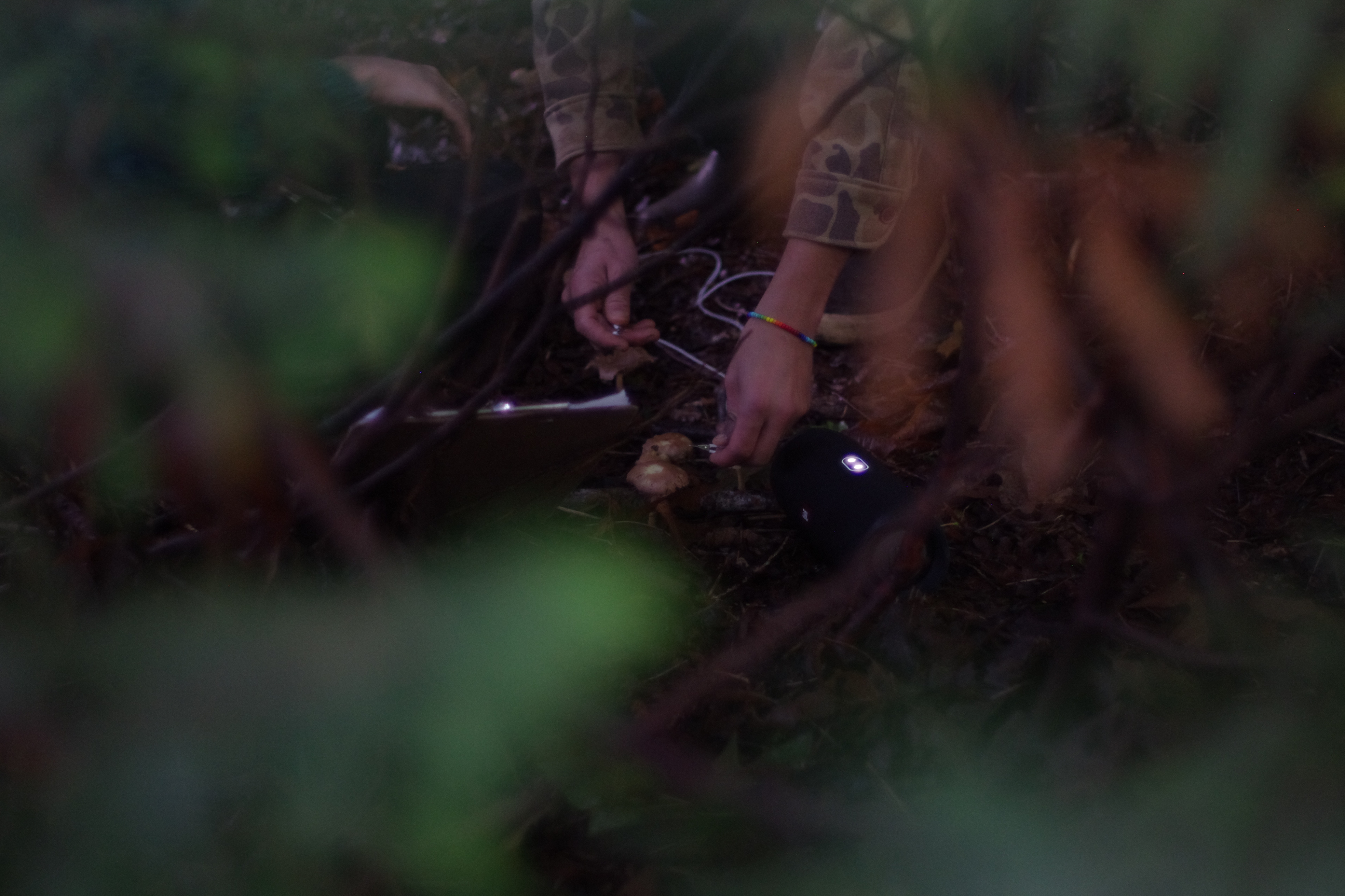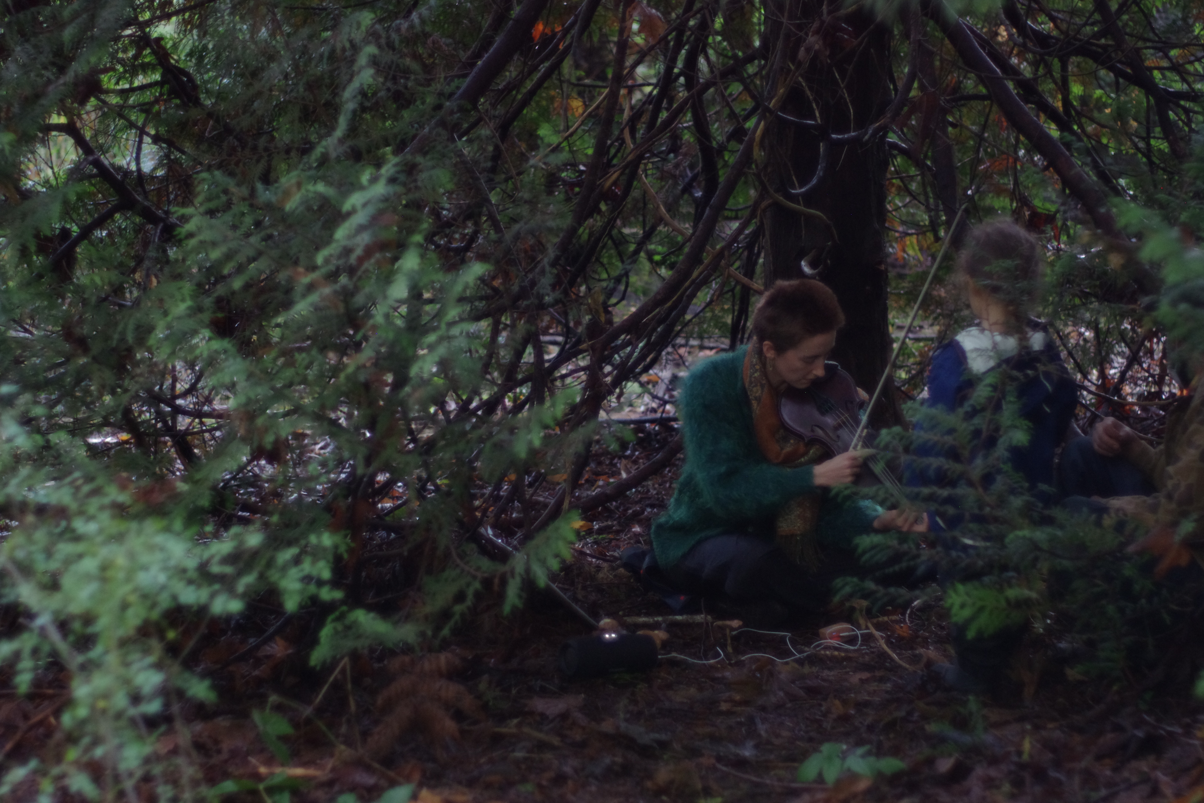 Today we went on a one-of-a-kind mushroom sonic adventure. We gathered in Iyal’mexw/Jericho West Park and started by practicing a Deep Listenig score written by Pauline Oliveros, where participants engaged in a dialog with the sounds surrounding them. We then walked in silence across several trails, imagining our feet as ears, and noticing the soundscape ecology. We concluded our session by an interspecies concert, featuring a Ramaria (coral mushroom) and a group of Gymnopus confluens (Fuzzy Foot) heard through a biosonification device, improvising with Clara Rose on violin, and Robyn Jacob on melodica.