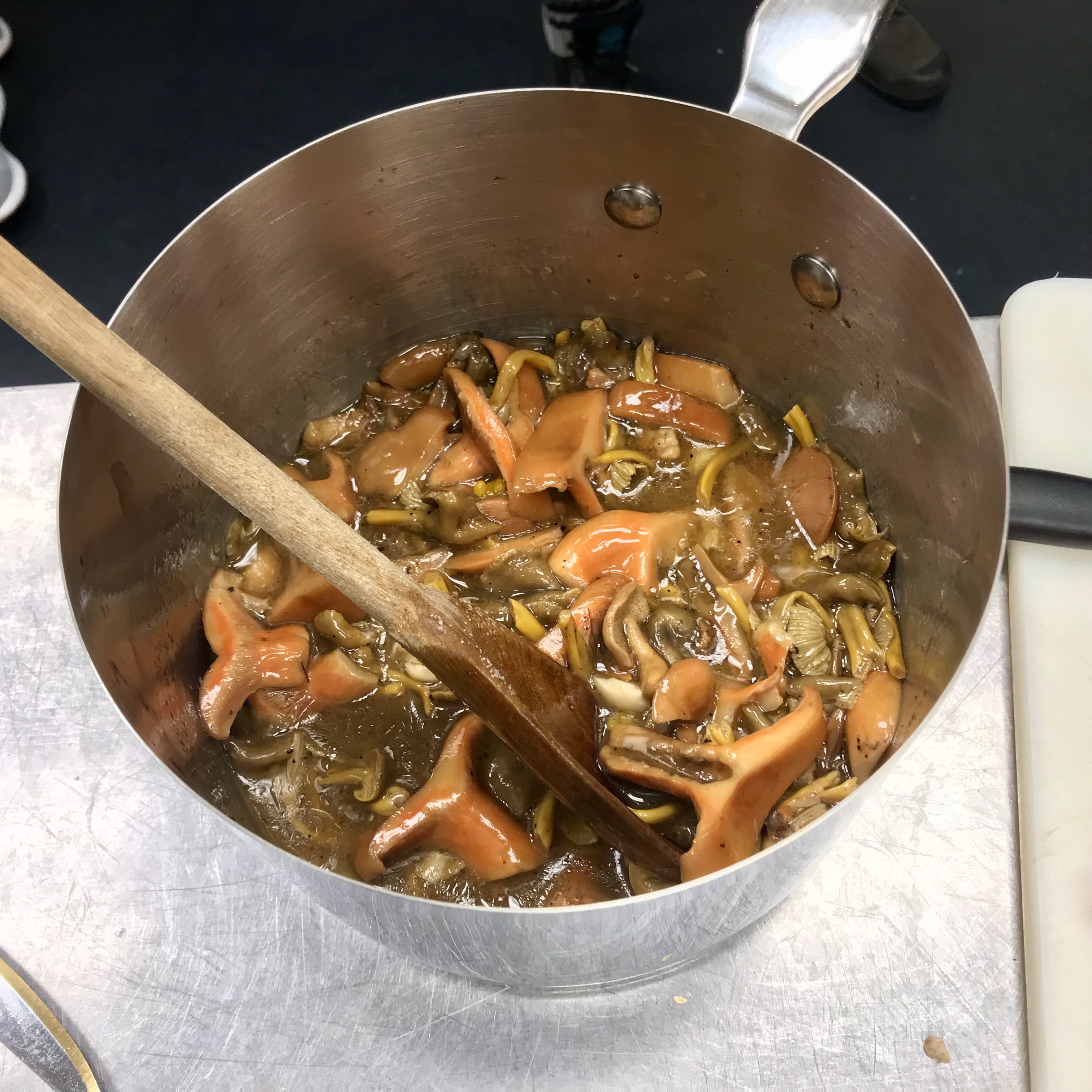 This week, we were surrounded by food lovers who helped us cook a series of dishes honouring the qualities of local wild fungi. With started the evening with a mixed greens salad with a warm mushroom vinaigrette, which included Saffron Milk Caps (Lactarius deliciosus) and Yellow Foot (Craterellus tubaeformis). Our main dishes were a small plate of Chicken of the Woods (Laetiporus gilbertsonii) and Oyster Mushrooms (Pleurotus ostreatus) battered, deep fried, and served with homemade lacto fermented dill pickles, as well as a delicious Tom Kha Hed soup, highlighting the seafood like qualities of wild Lion’s Mane (Hericium erinaceus). We ended our meal with a decadent Chanterelle (Cantharellus formosus), apple and quince pie, and a cup of Chaga (Inonotus obliquus) tea.