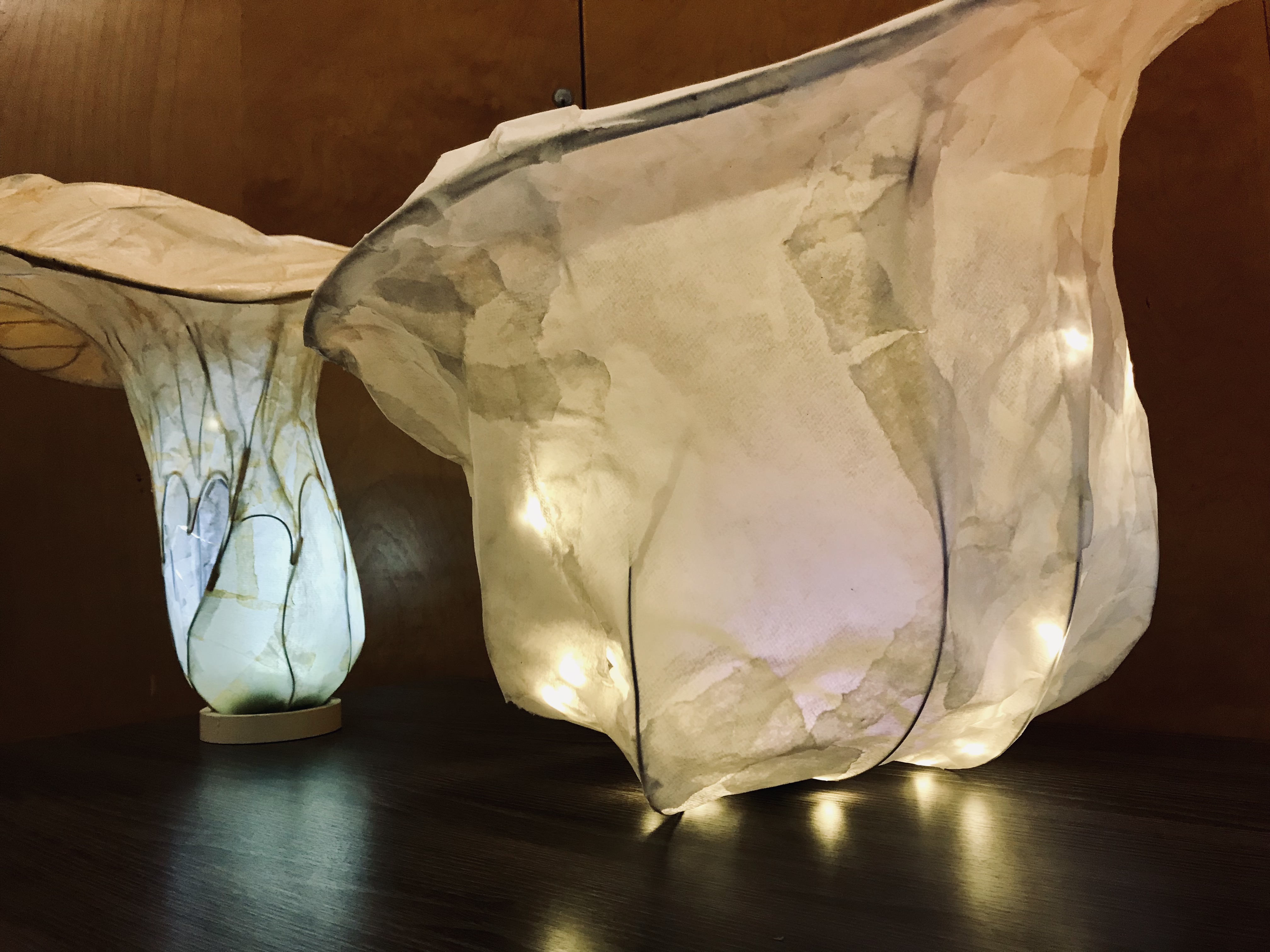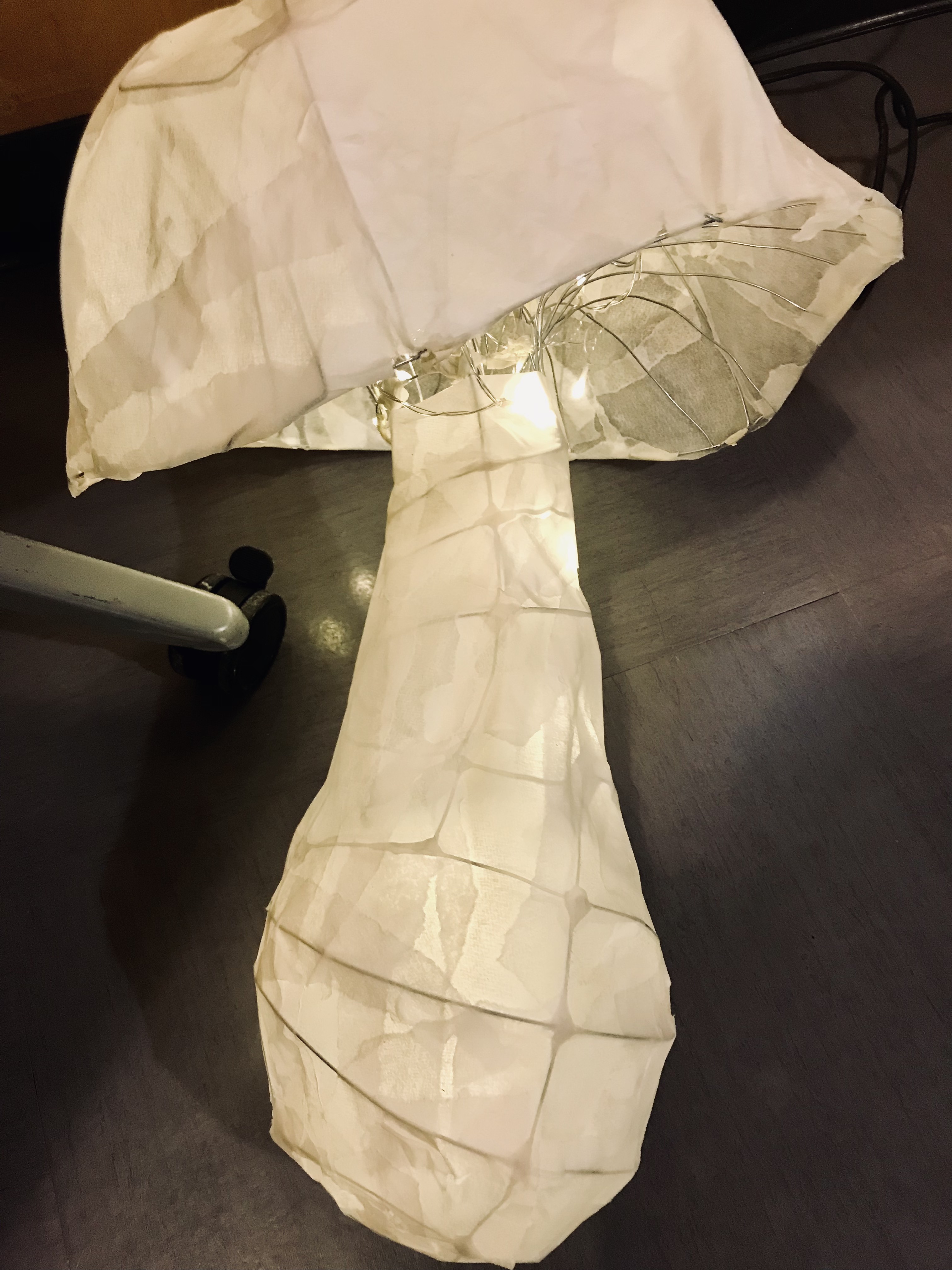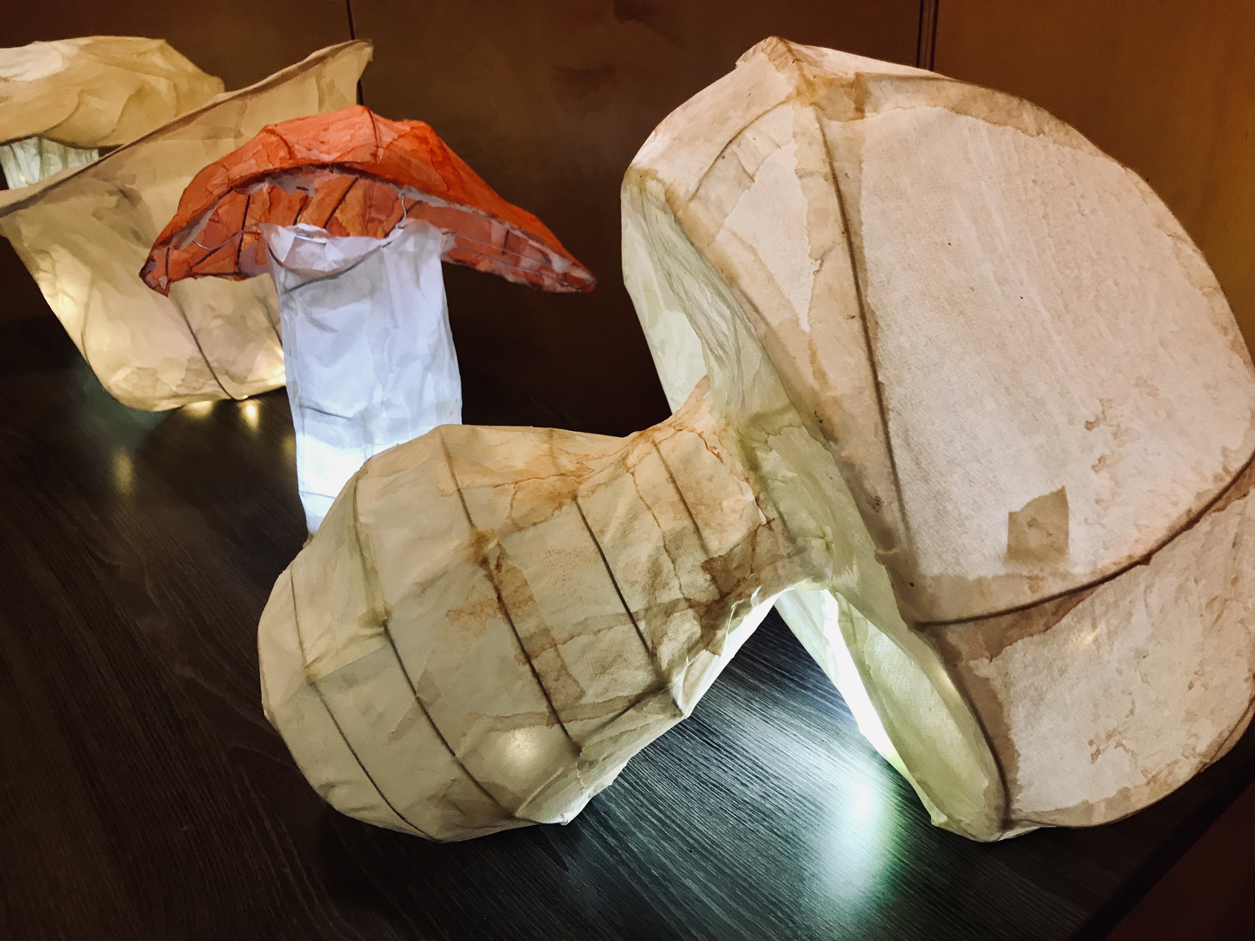 Today, we worked diligently at creating beautiful mushroom lanterns, each of us building a wire armature and covering it with delicate rice paper. Chanterelles, Amanitas, jellies, Russulas and Boletes were some of the many inspirations. After five hours of focused work, participants are looking forward to lighting and displaying their lanterns during our lantern parade and celebration next week.