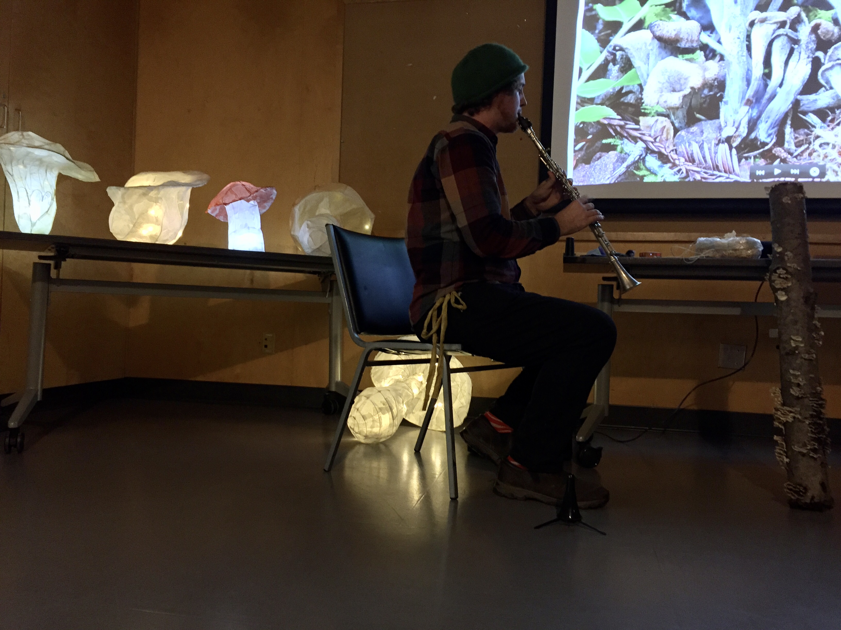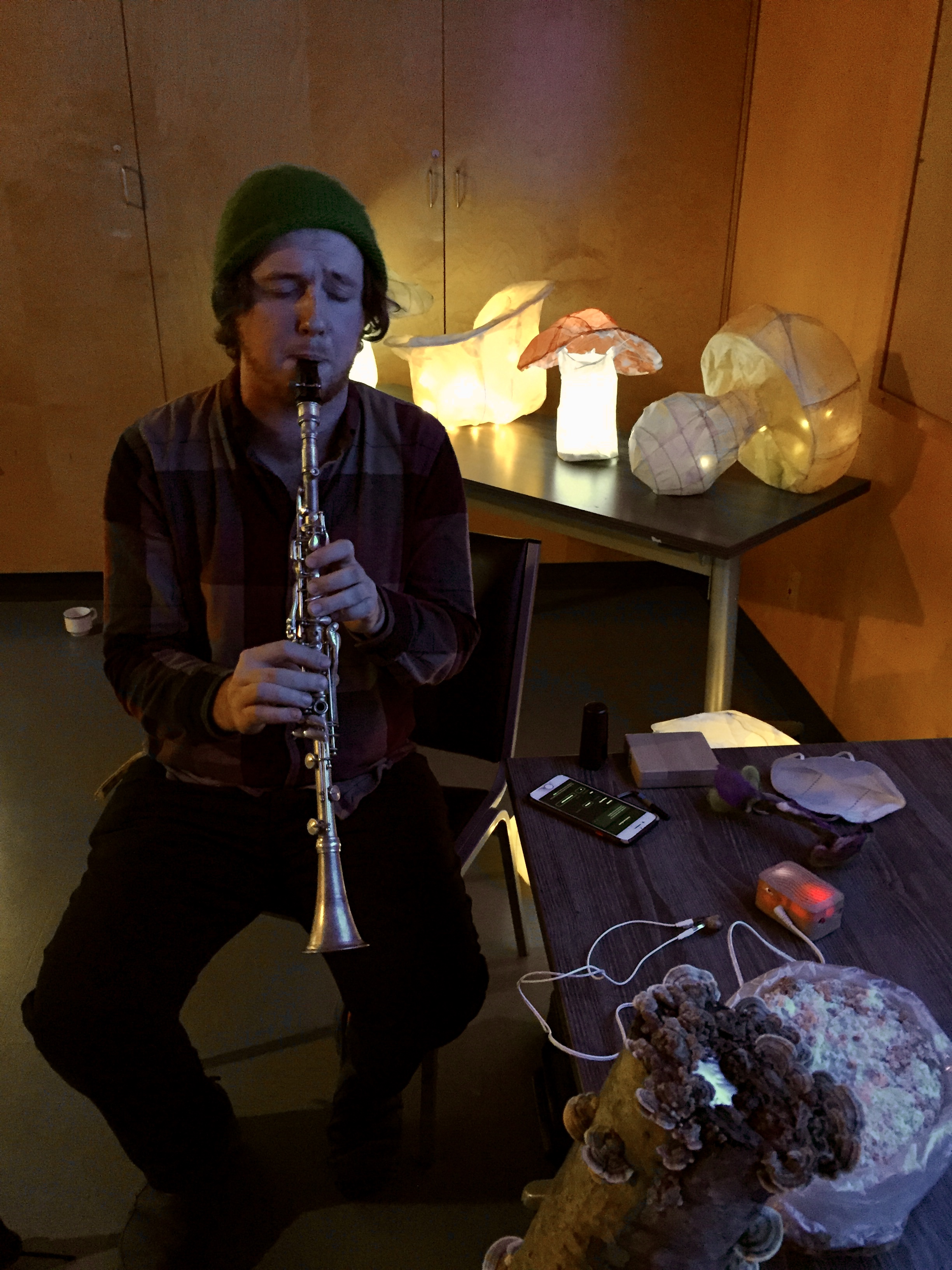 We celebrated the end of the mushroom season and the conclusion of our residency over mushroom snacks and teas. We exhibited the fungal map of the neighborhood, the collective mushroom cookbook, mushroom lanterns made by the participants, and presented the documentation of our projects throughout the year. We felted one last time together, and listened to fungi through biosonification. We concluded the evening by listening to a concert of improvised music between a live musician and a turkey tail mushroom (!)