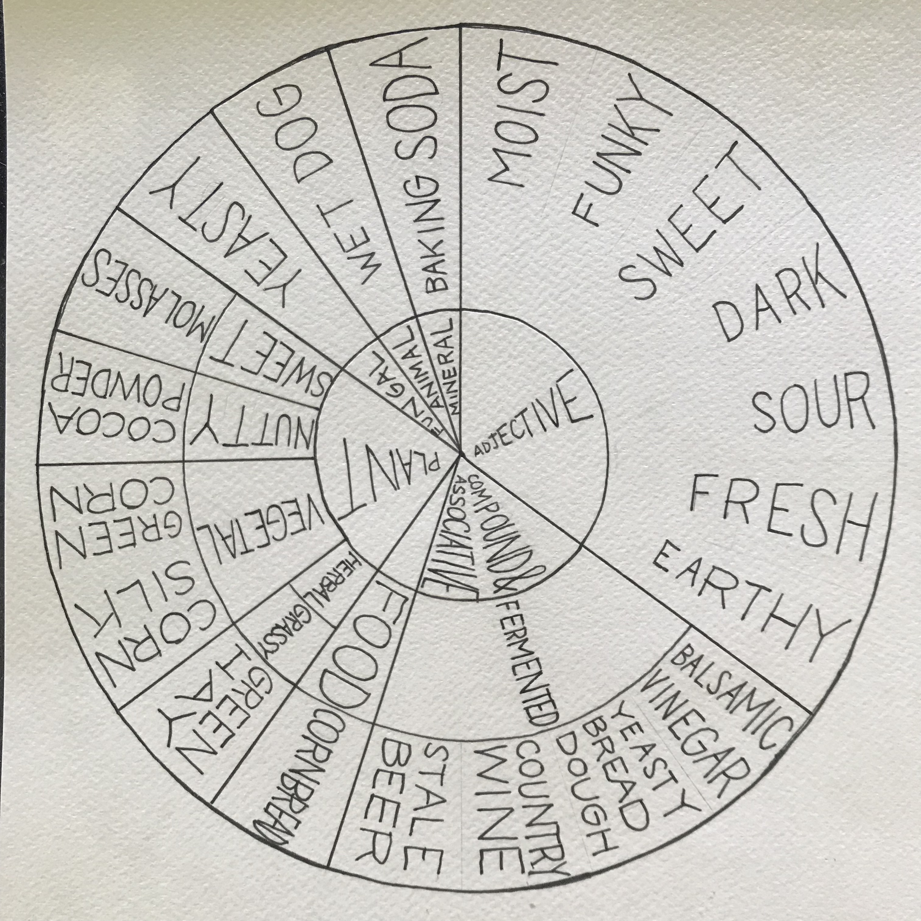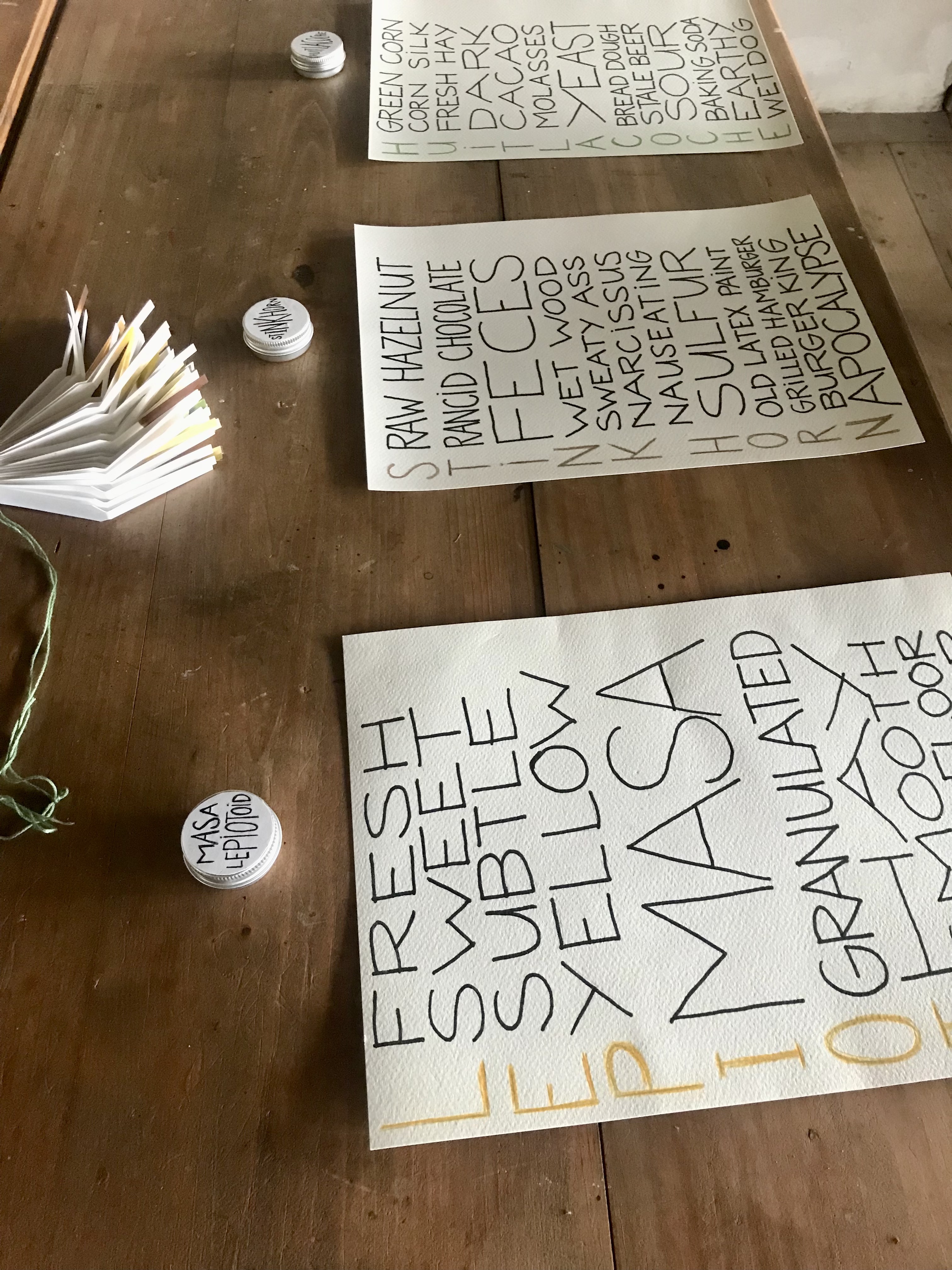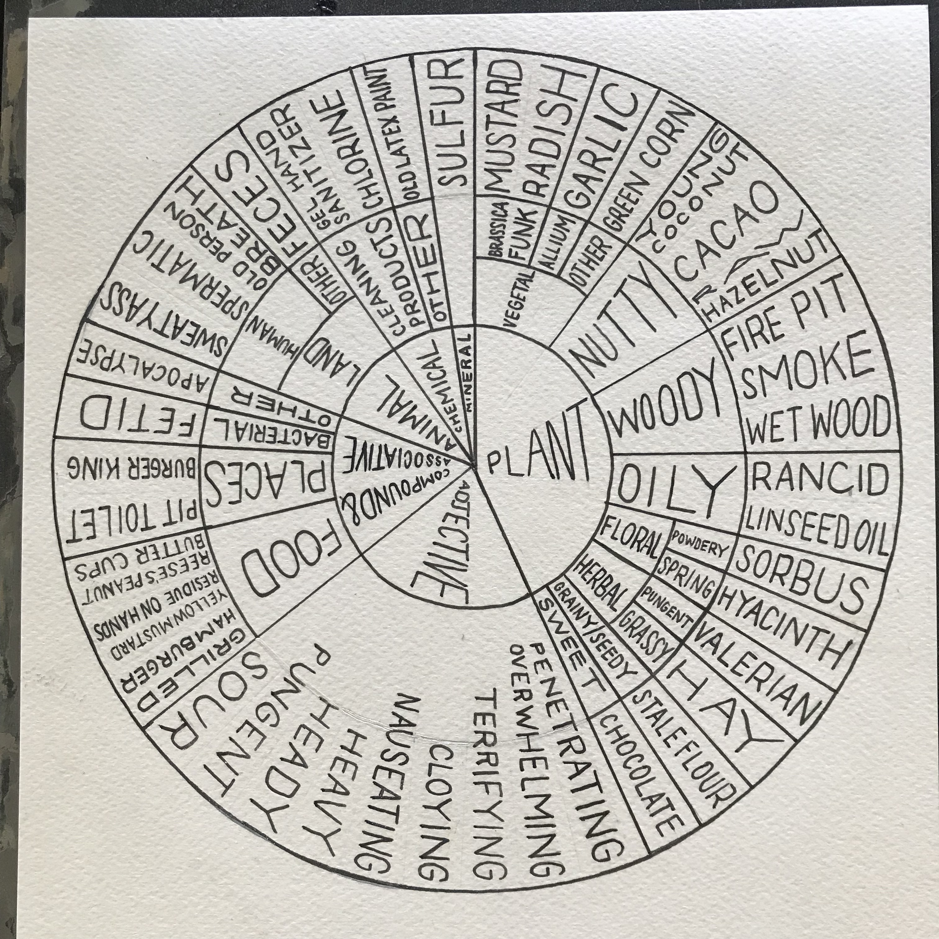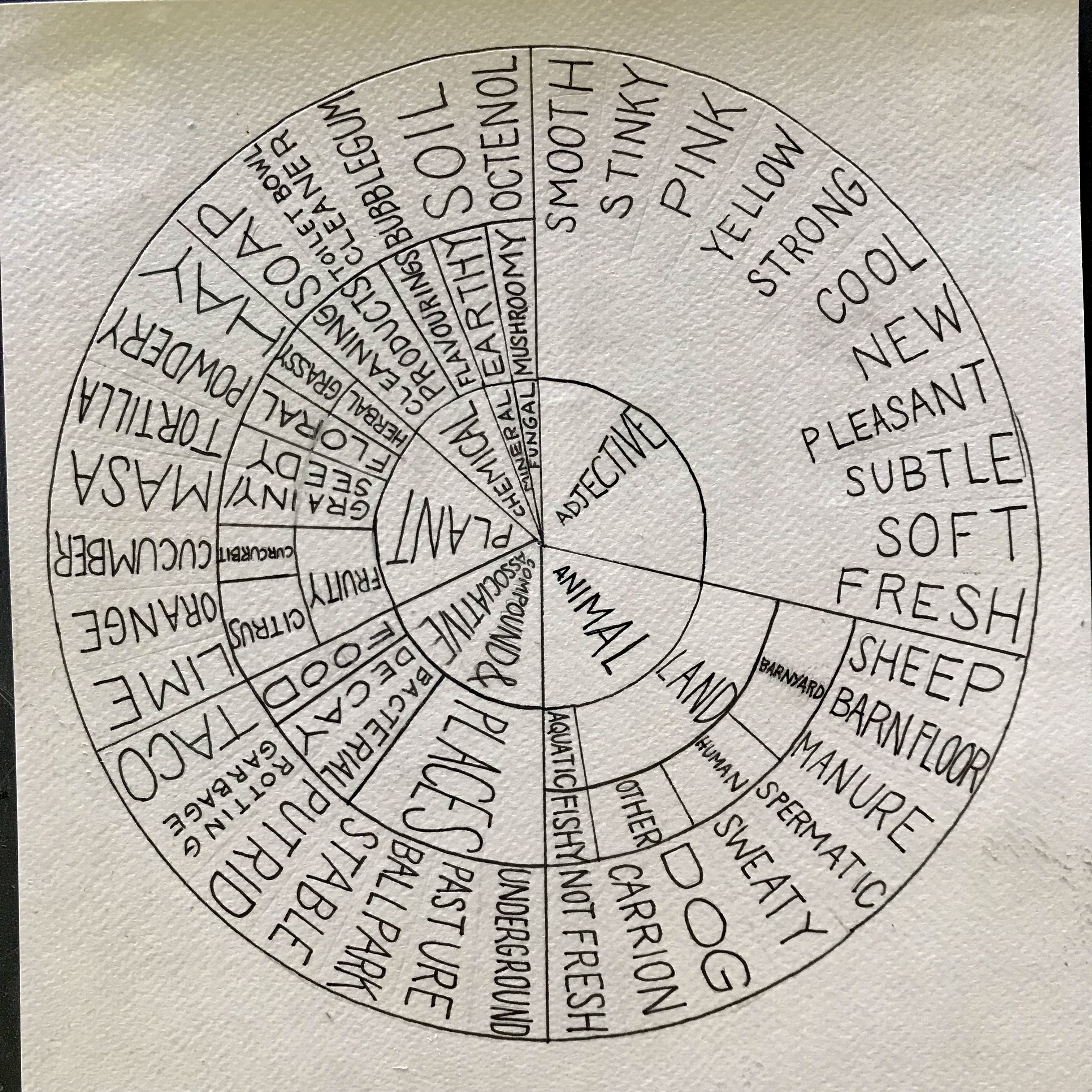 Together with Willoughby Arévalo, they created scent portraits of these same mushrooms, which included aromatic wheels for each fungi, vertical poems based on theirs smell descriptors, and watercolor portraits.