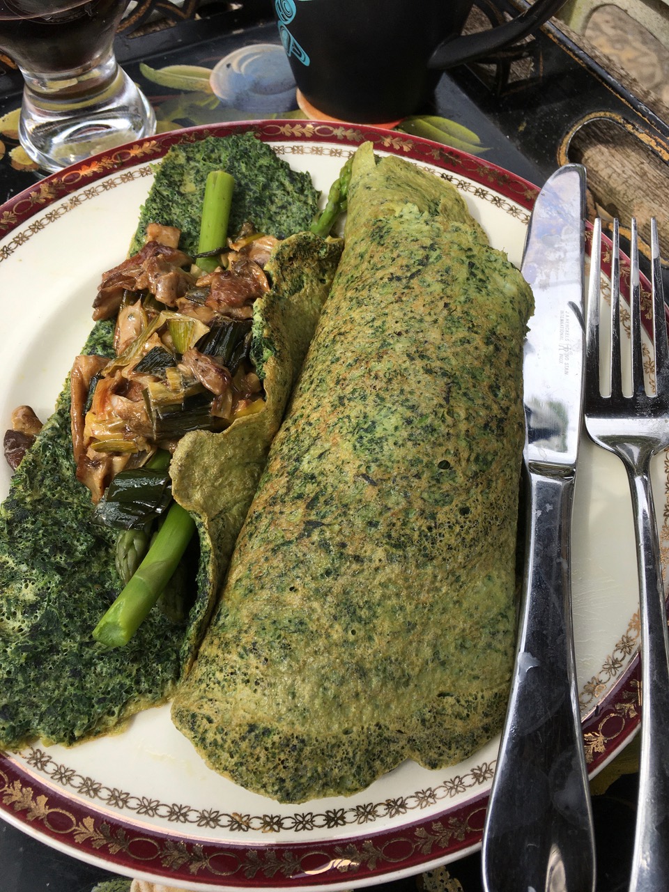By Carmen Rosen Fry sliced porcini mushrooms in butter and cream Sauté leeks until soft. Add to porcini. Steam asparagus Crepes 1 cup steamed and pureed stinging nettles 3 tablespoons tapioca powder 3 eggs Cook like a split between a crepe and an omelette (put a lid over to steam the top rather than tryingContinue reading “Porcini mushrooms, leeks and asparagus in stinging nettle crepes”