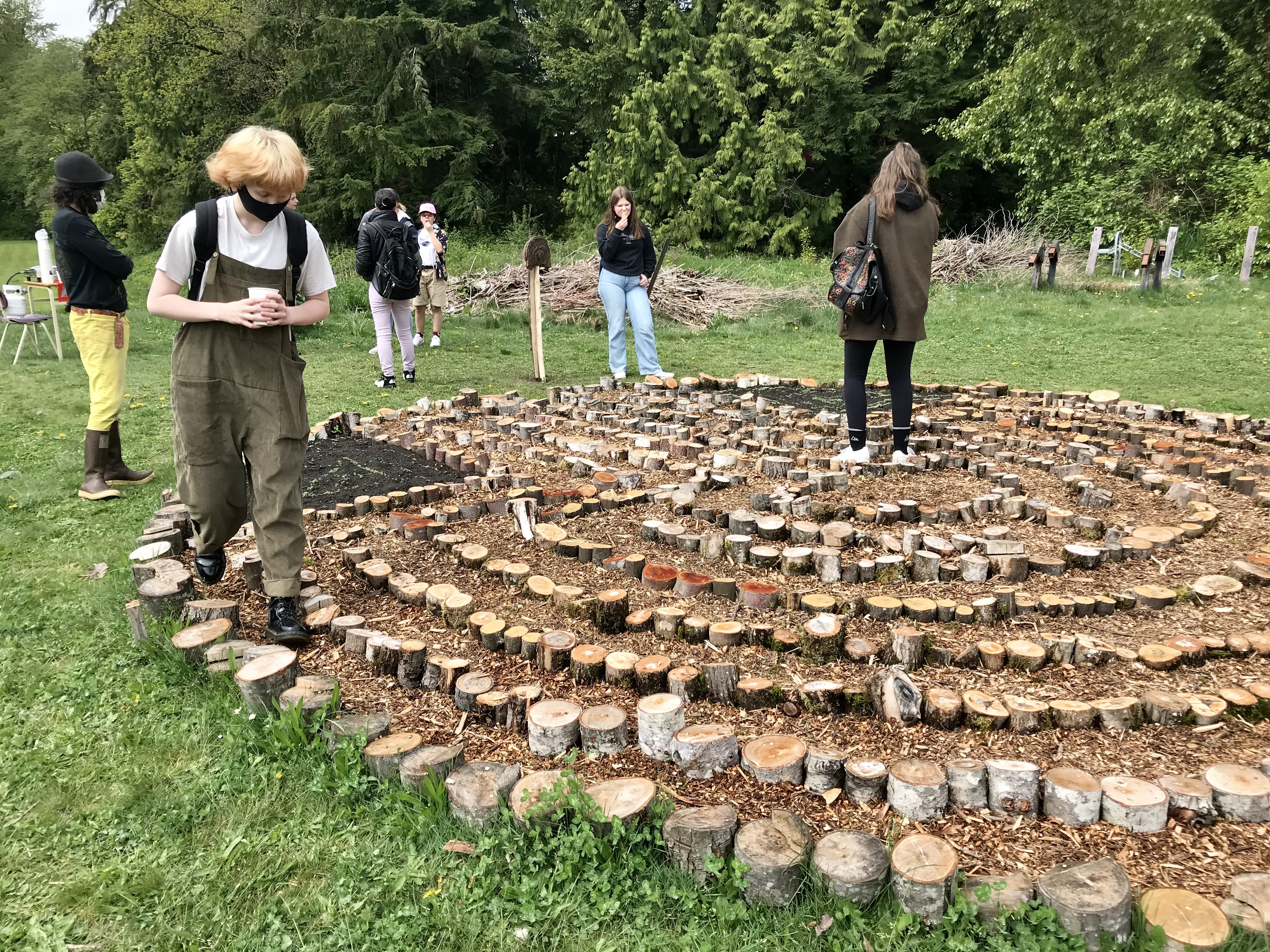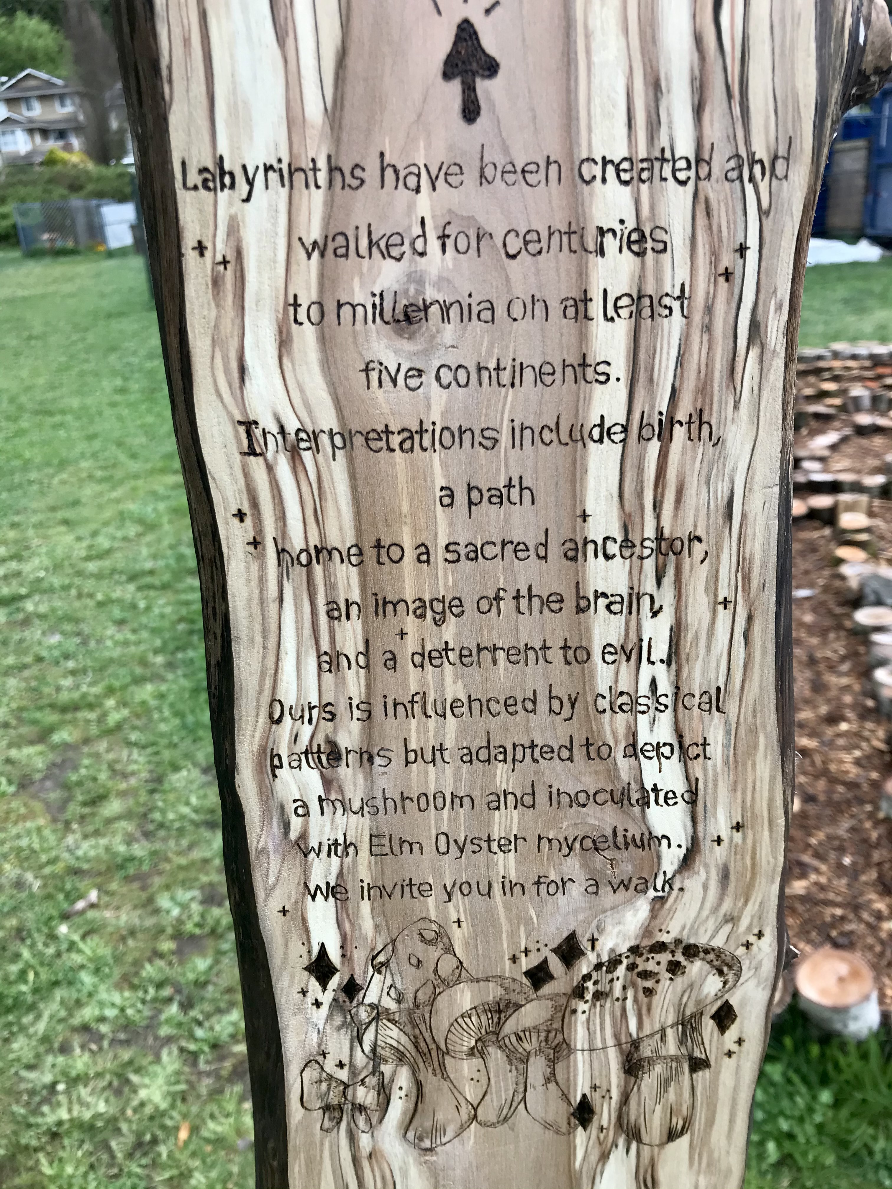 Labyrinths have been created and walked for centuries to millennia on at least 5 continents. Interpretations included birth, a path home to a sacred ancestor, an image of the brain, and a deterrent to evil. Our labyrinth was inspired by classical patterns, but adapted to depict a mushroom and inoculated with Elm Oyster mushroom mycelium. It was built and installed in the school garden of Mountainside/SmanitaXan Secondary School, in collaboration with students and staff in 2021. This project was produced under the Art & Mycology Program funded by North Van Arts and ArtStarts.