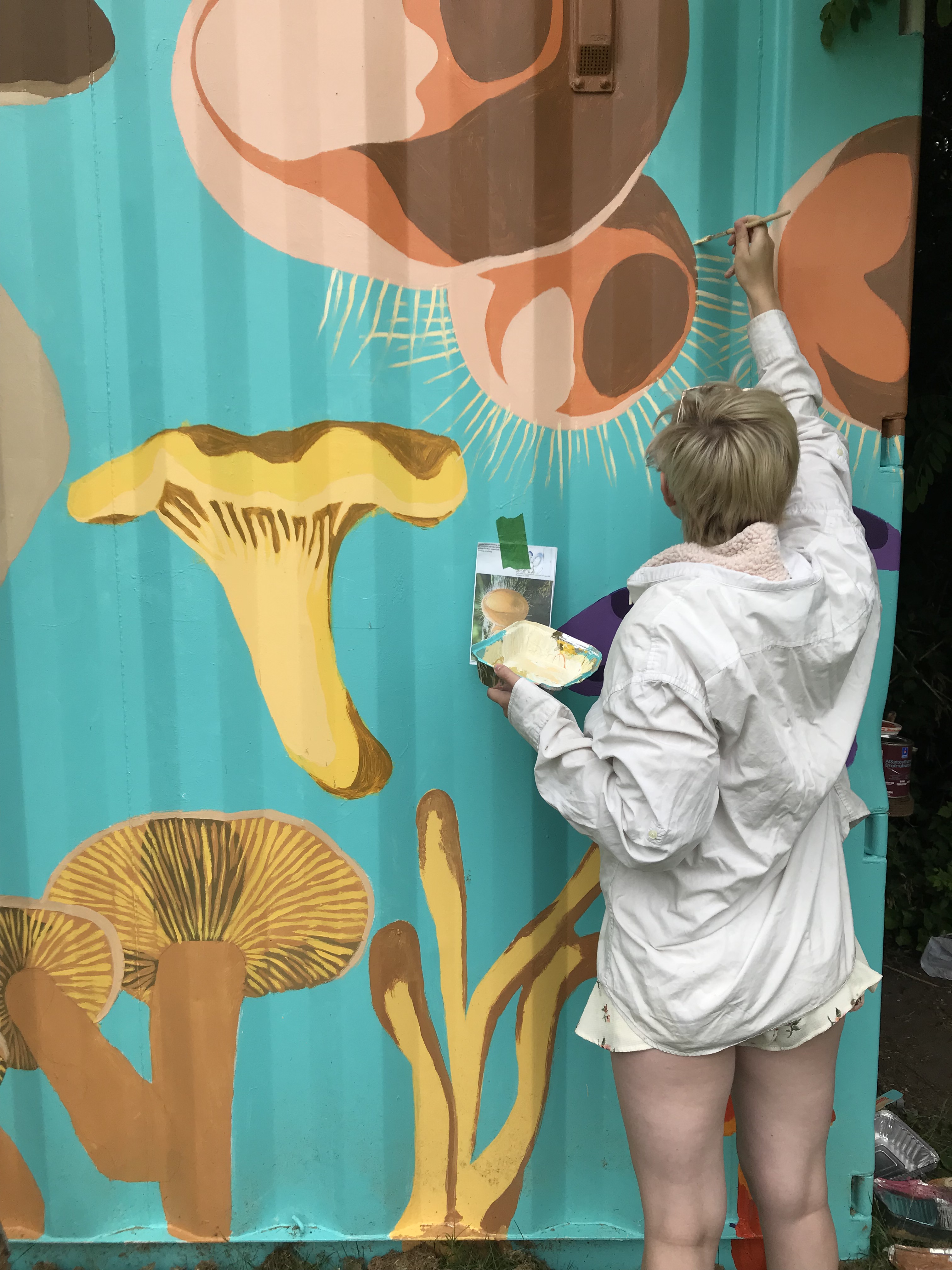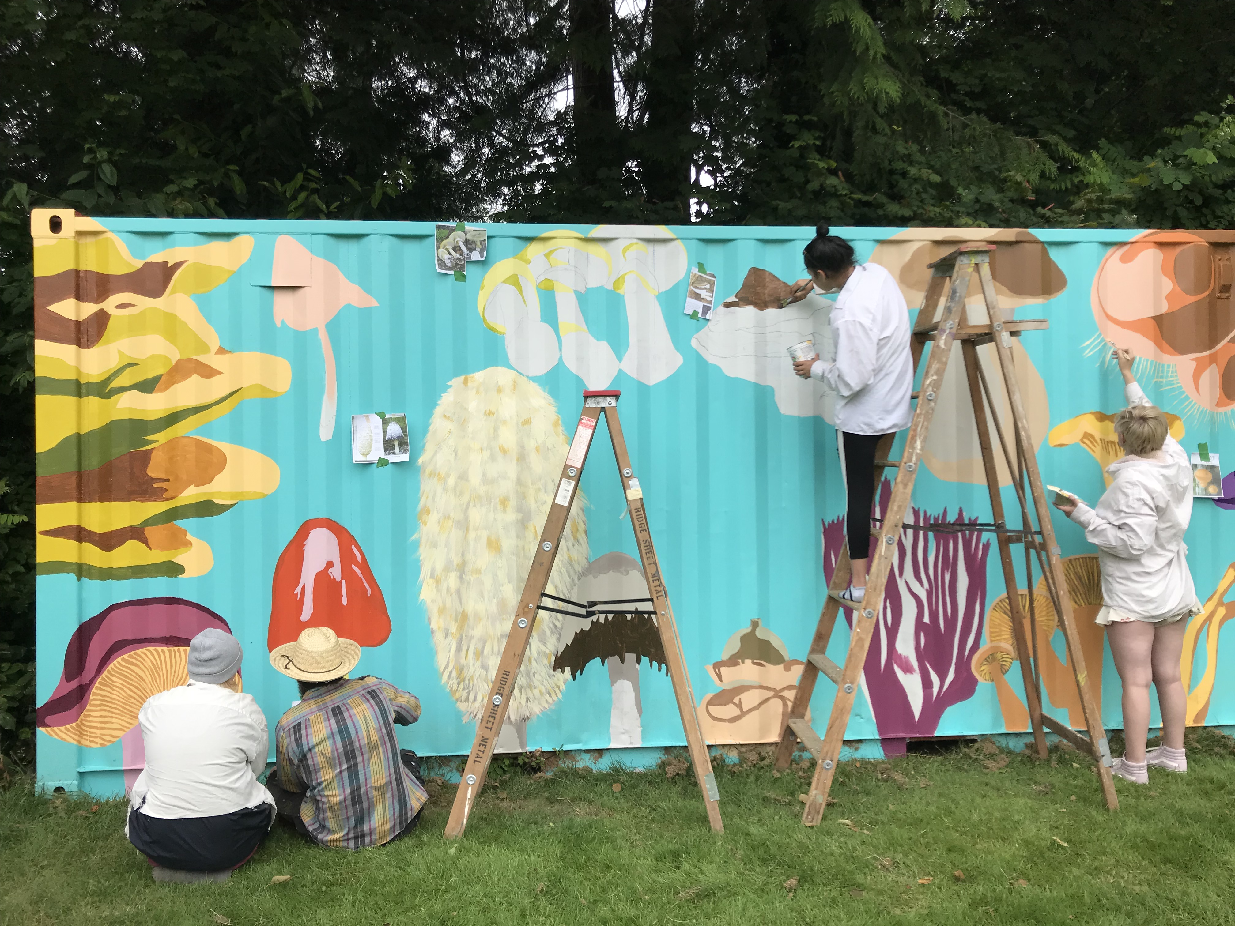 This collective mushroom mural was inspired by a diverse variety of fungi species and is painted on a storage container currently located in the school garden. This project was created in 2019 during the Art & Mycology Program at Mountainside/SmanitaXan Secondary, supported by North Van Arts.