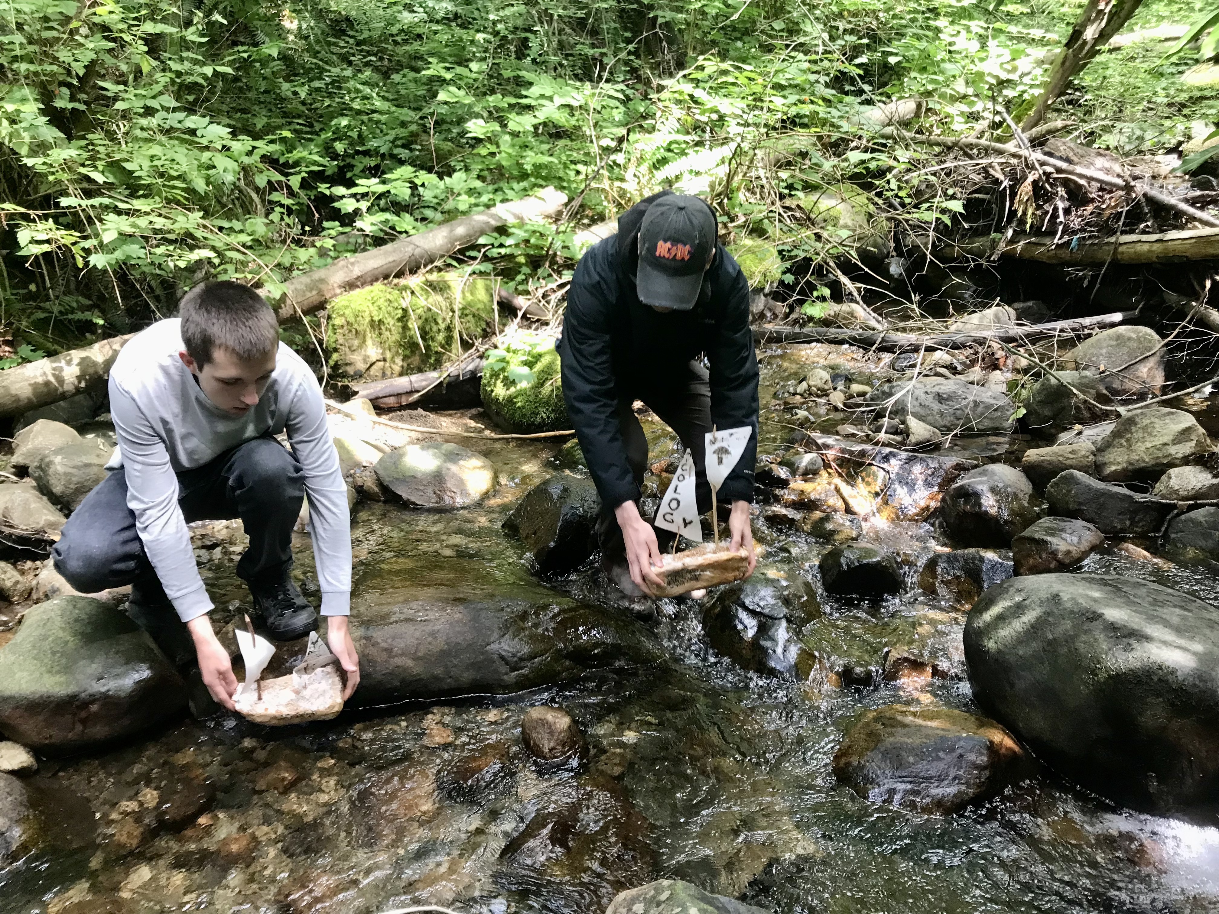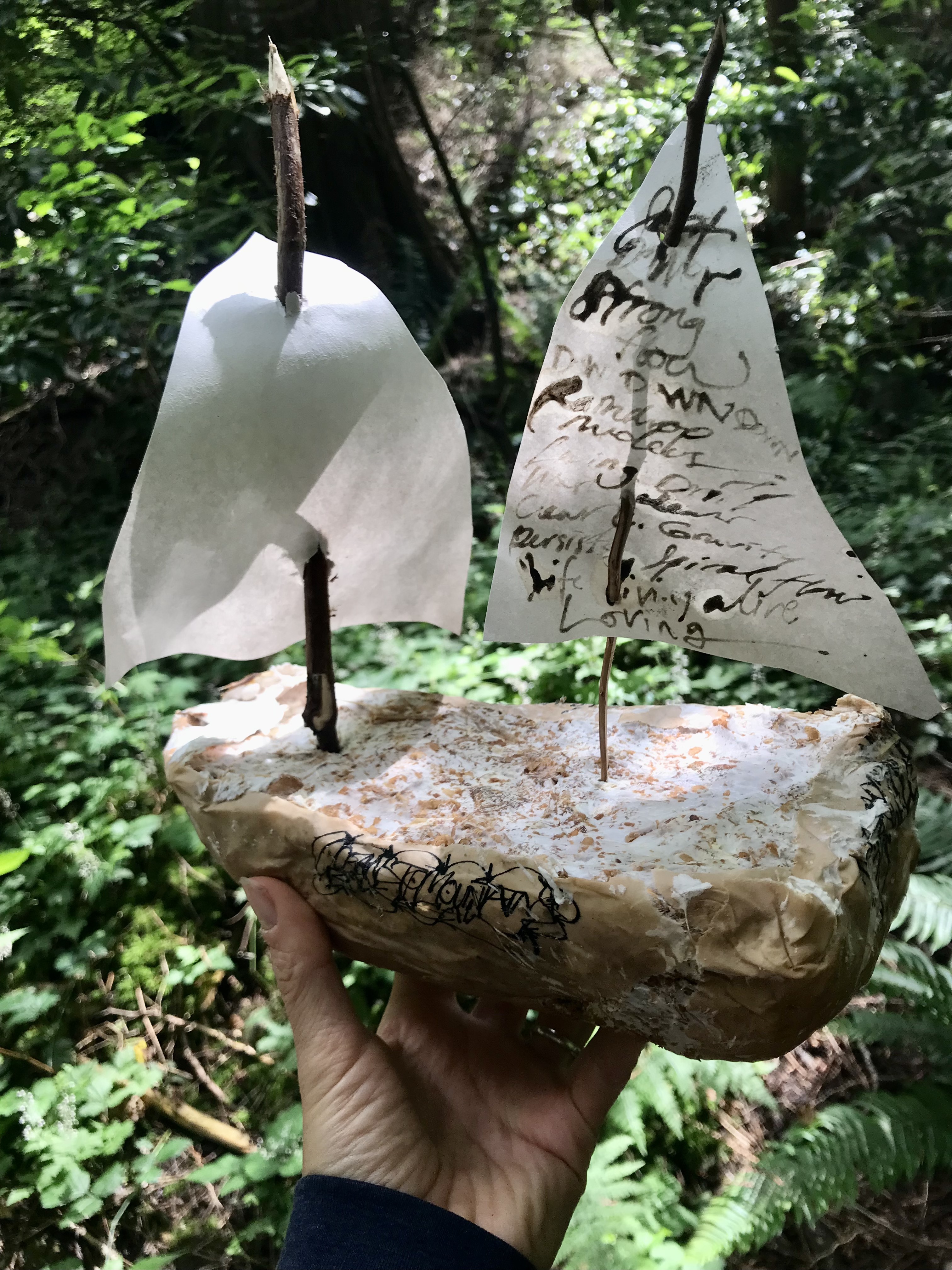 We designed moulds out of clay in the shape of miniature boats, in which we grew a native strain of Oyster Mushroom mycelium that we cultivated ourselves on upcycled plant-based materials, including prayers for the land and water written in India ink on biodegradable paper, which was eaten by the growing mycelium. After taking the boats out of the moulds, we created sails with biodegradable paper, Shaggy Mane ink and found sticks, writing and drawing more intentions and wishes for the future of the stream. These vessels, made of living mycelium, sailed in the urban stream behind the school, helping to bioremediate chemical and mineral pollutants in the water from road runoff, and eventually fully decomposing and helping to build fertile soil as a small symbolic action of caretaking. This project was produced under the Art & Mycology Program funded by North Van Arts and ArtStarts.