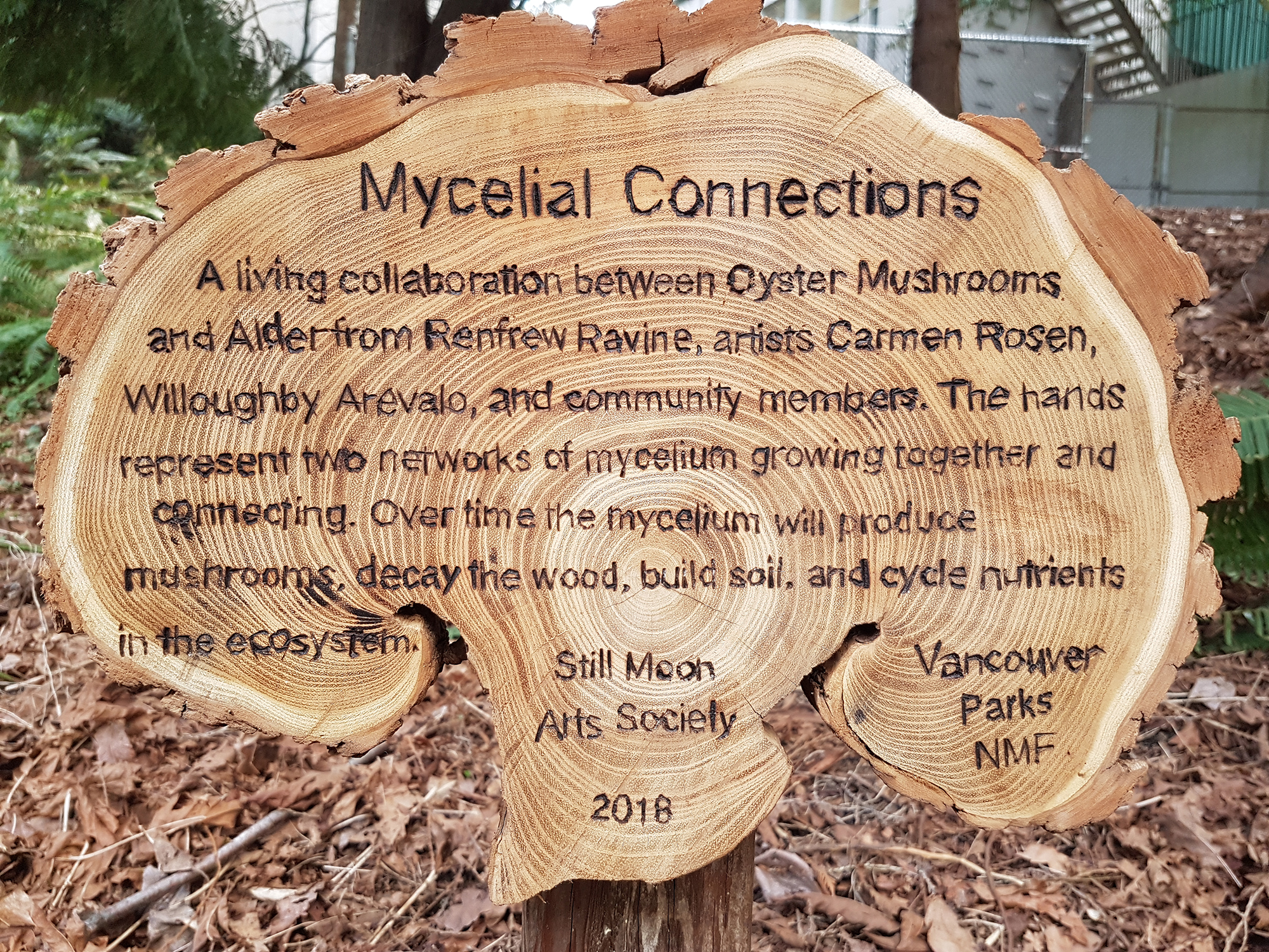 The installation of Mycelial Connections and Fruiting Bodies was celebrated on April 25th, 2019 with an Eco-Art Walk & Talk by Carmen and Willoughby. The walk was followed by mushroom soup served in the Vancouver Public Library’s Renfrew Branch.