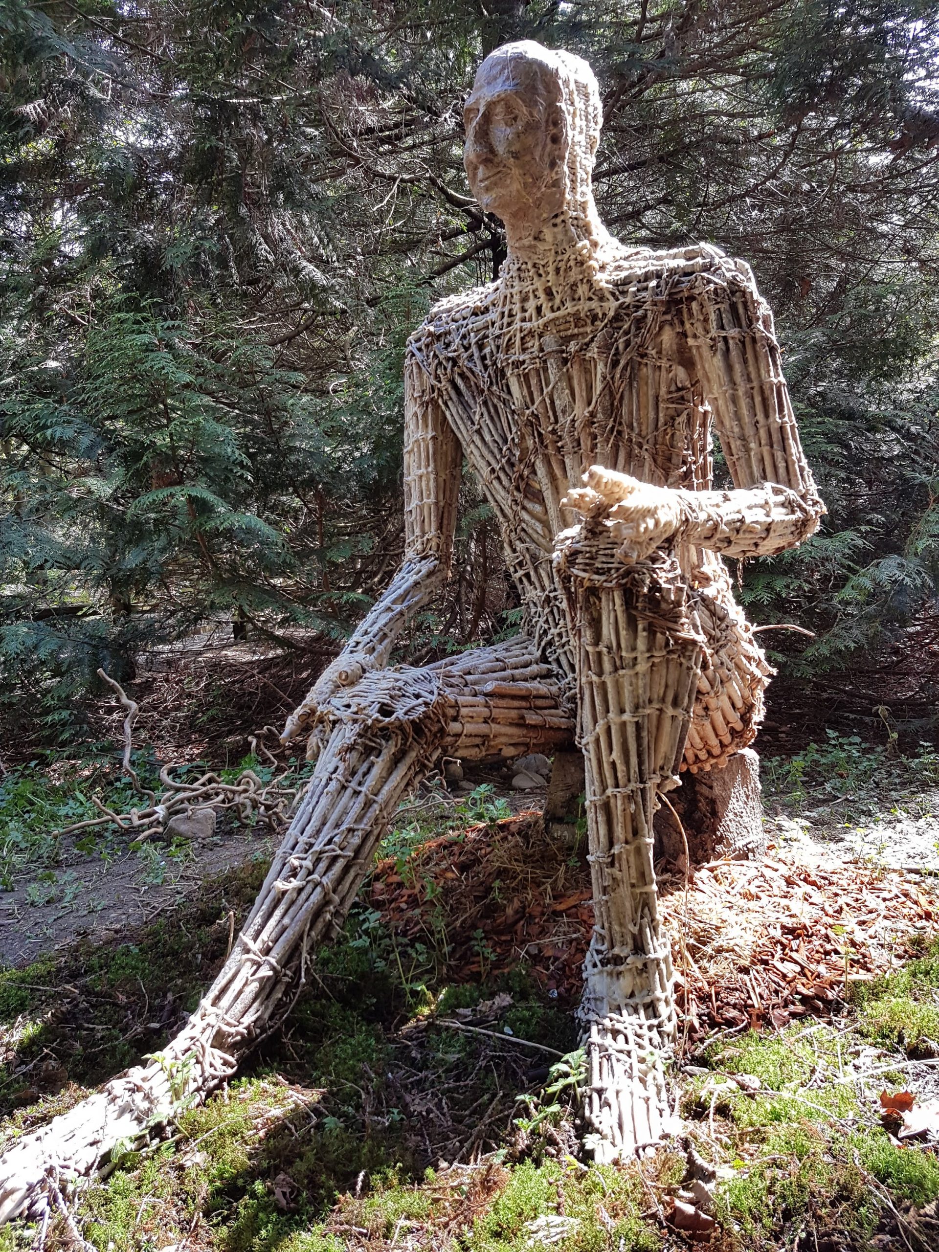 Fruiting Bodies is the second phase of Mycelial Connections, with figurative sculptures about the cycles of life, death, and regeneration. They are made with Oyster Mushroom mycelium to bind and eat sawdust, natural textiles dyed with plants and mushrooms, plant materials from Renfrew Ravine including woven English Ivy, Alder, Maple, and Hazel, and are sealed with beeswax.
