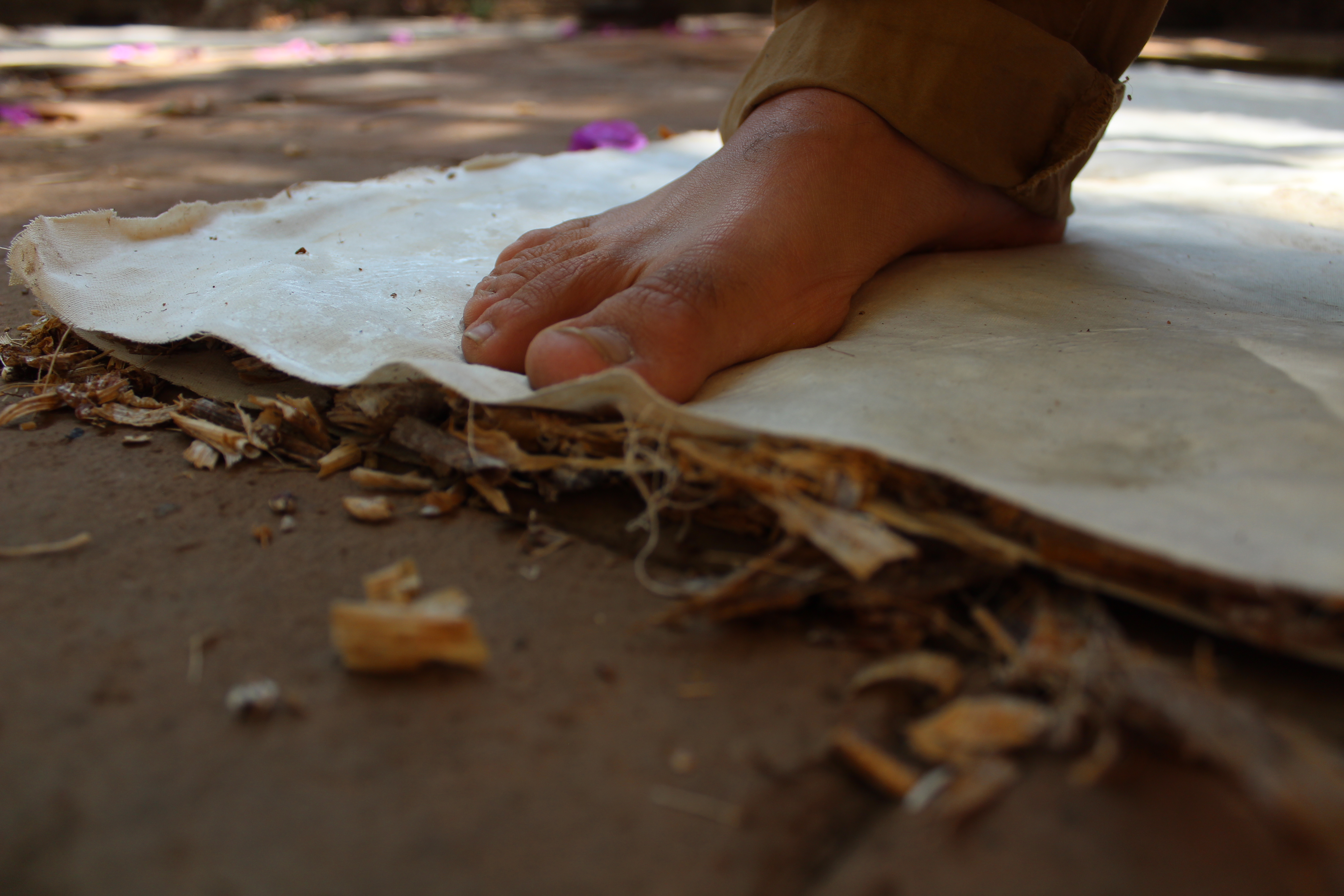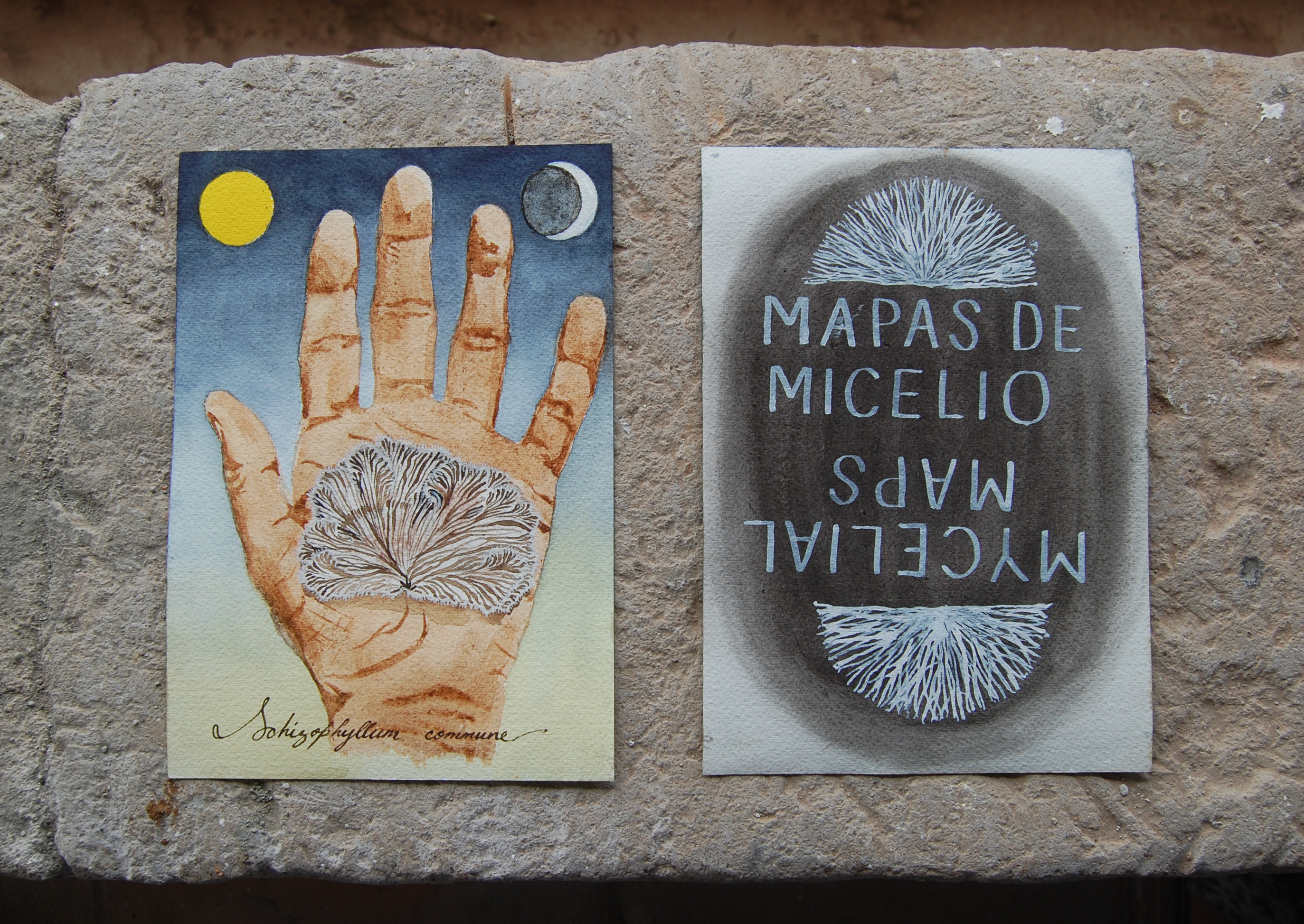 Willoughby Arévalo: Hand painted cards with fungal pigments, living mycelial mat (local corn husks and cotton, inoculated with oyter mushroom mycelium)
