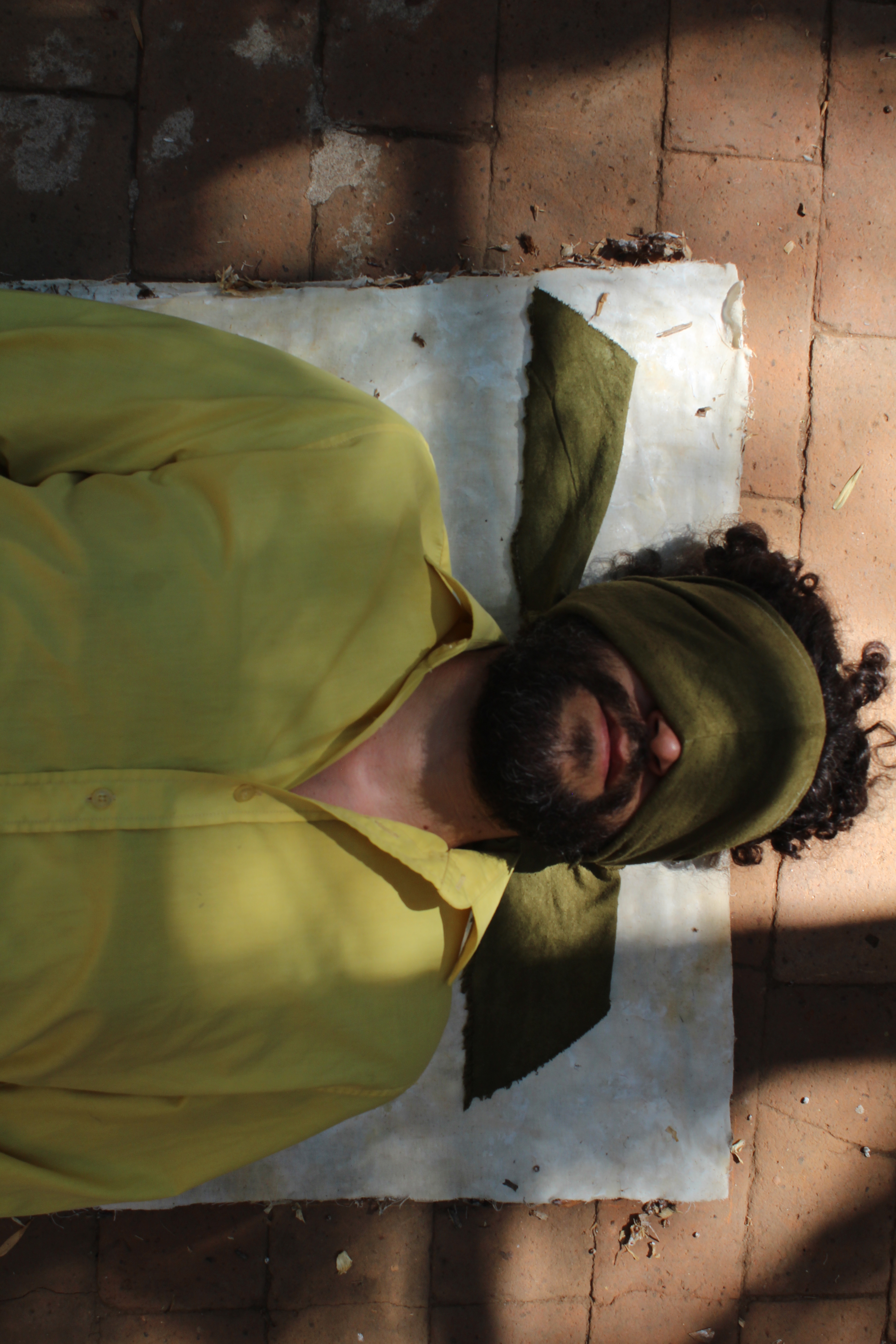 Mycelial Body Maps is a series of one-on-one performances inspired by the sensorial qualities of selected fungi and their felt connections to the human body. Participants first select a hand painted card, which will determine the experience they will be guided through. They are then invited to wear a blindfold dyied with the Dyer’s Polypore (Phaeolus schweinitzii), and lay down on a slightly moist, cool, and aromatic living mycelial mat, while a performer uses touch, movement, sound and objects to heighten their sensorial experience.