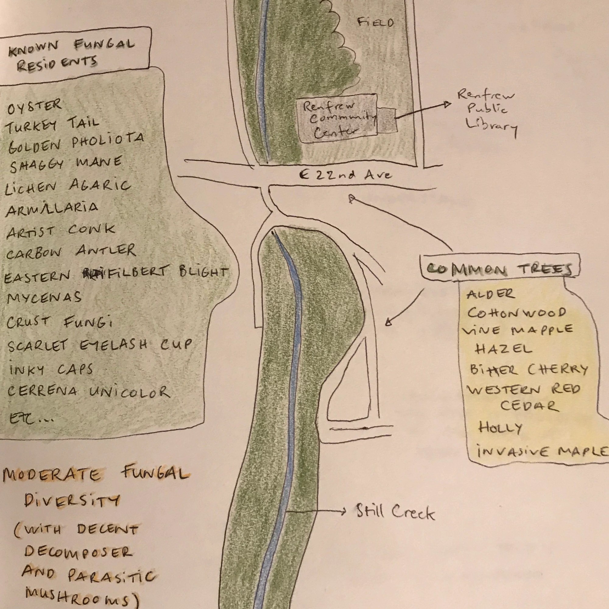 We met at Cariboo Park and discussed the relationship between fascia and mycelium, as well as the interconnectedness of species and our ecosystem. We moved with eyes closed and eyes open, focusing on listening, sensing, and responding to the space and living beings in and around us. We concluded our session with some writing and map making inspired by our movement explorations.